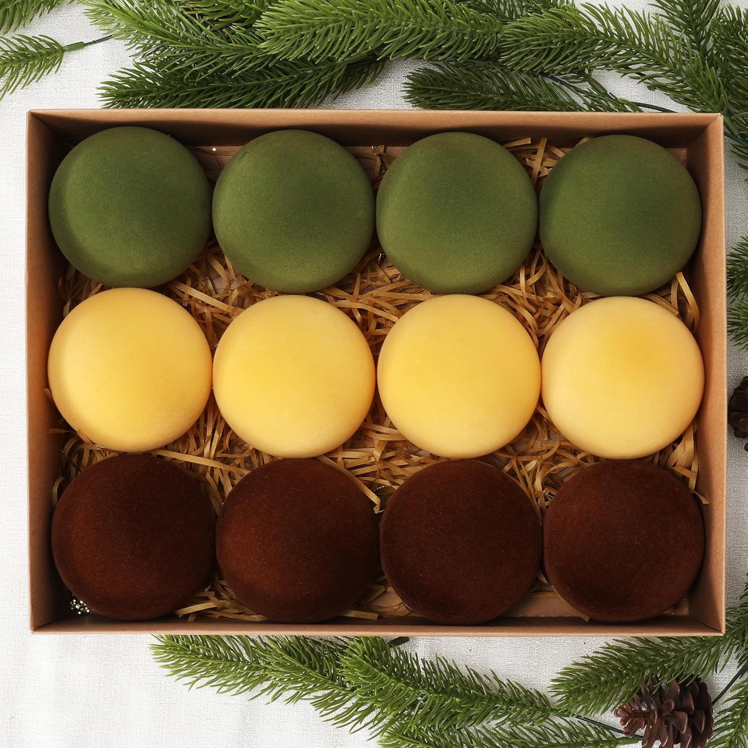• Set of 12 Velvet Christmas Balls – 3.15" Diameter: This beautifully curated set includes 12 Christmas balls, each measuring 3.15 inches (8 cm). Featuring a mix of solid-colored velvet ornaments and balls with hand-painted accents, this set adds rich texture and visual variety to your holiday decorations.