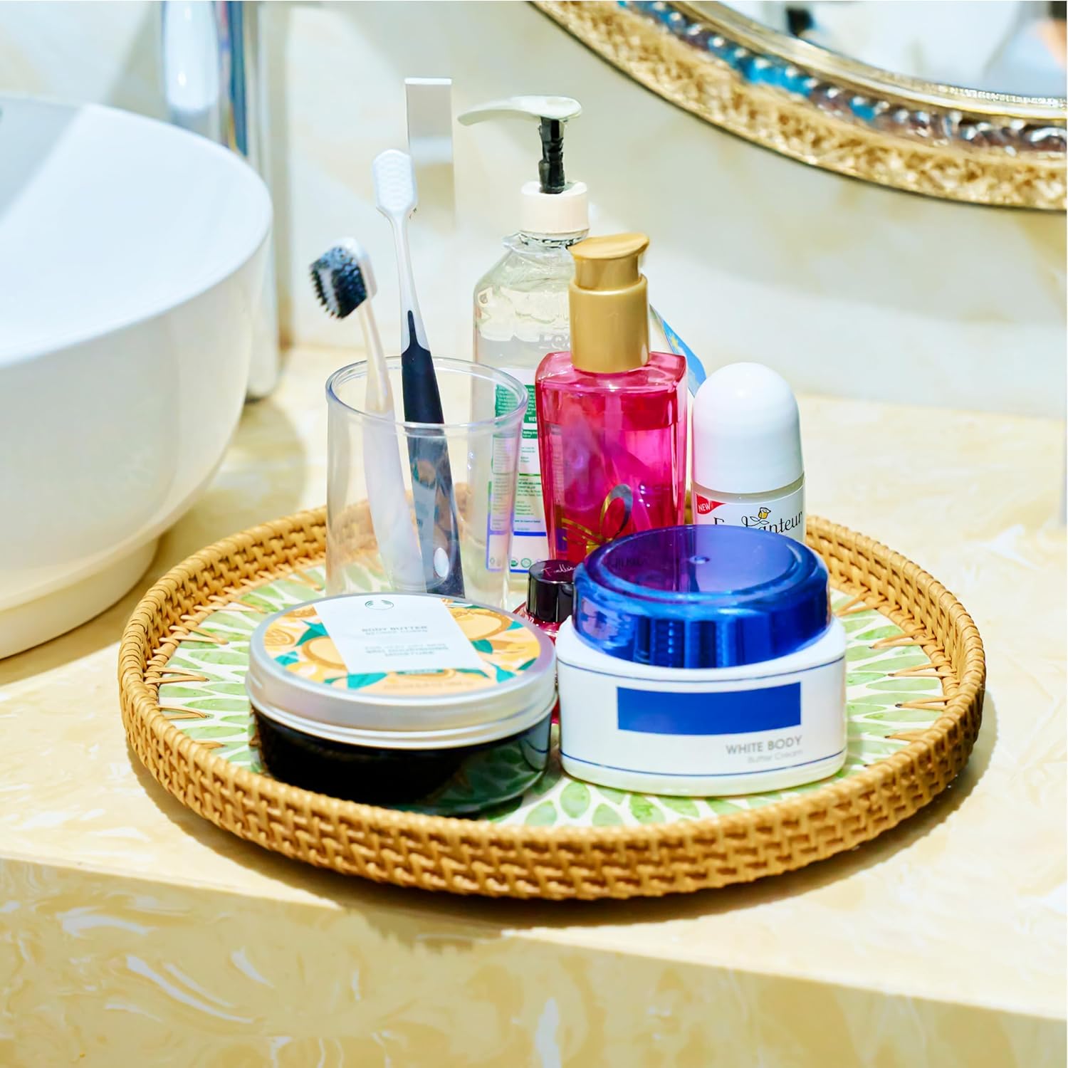 • 🎯 【Durable Rattan with Solid Wooden Base】: Made from high-quality, eco-friendly natural rattan and reinforced with a sturdy wooden base, this wicker tray ensures long-lasting use while offering a lightweight yet stable platform for serving or displaying items.