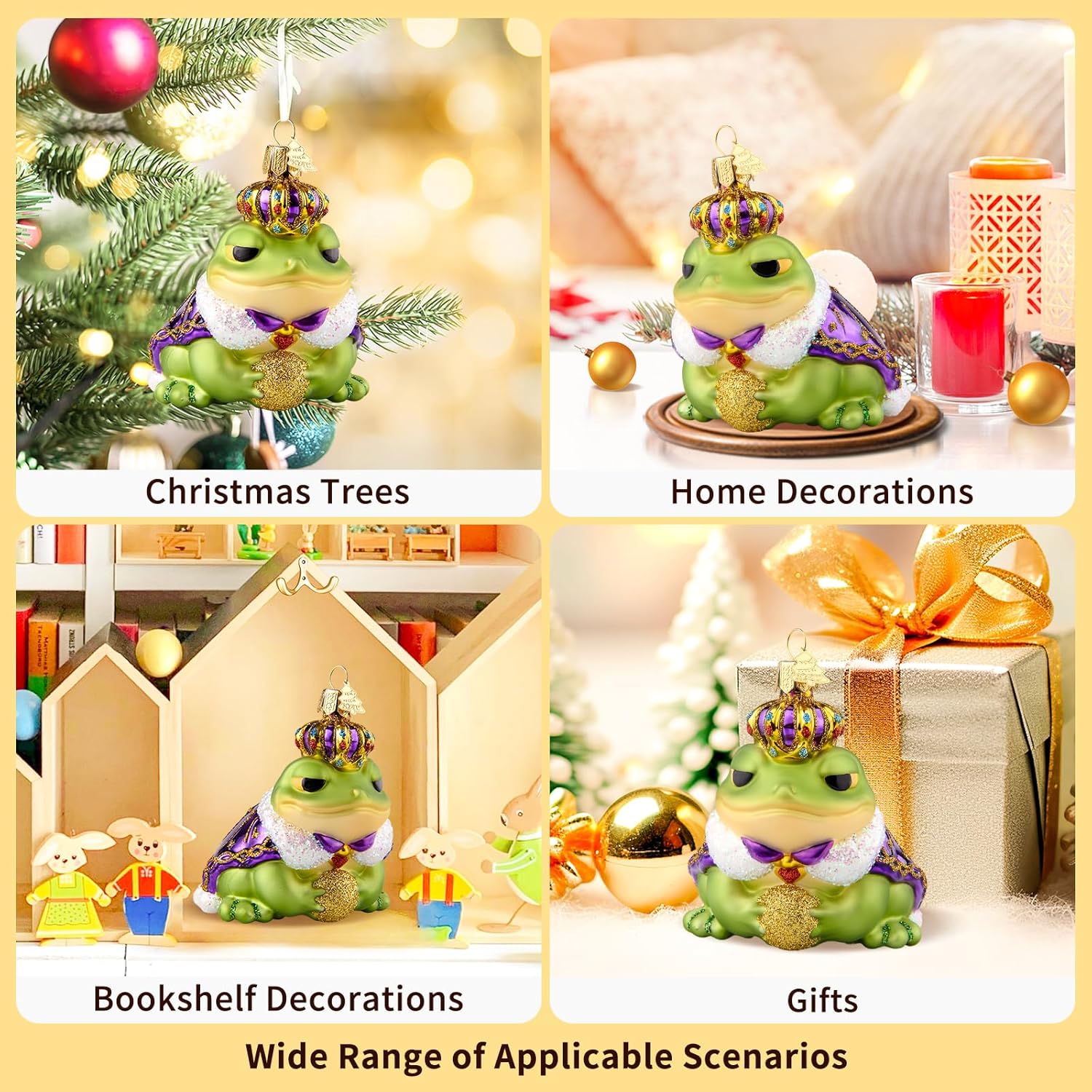 • Exquisite & Unique Design: Our glass Christmas ornament is themed around the image and story of the Frog Prince, with a crown on his head and a shiny purple cloak on his back. He holds a found golden ball in his hand, which is cute and vivid, expressing the beautiful meaning of kindness, honesty, and trustworthiness. The overall design of the frog ornament is purely hand-painted, with exquisite craftsmanship and delicate and vivid imagery. You can decorate any place you want and believe it can blend well