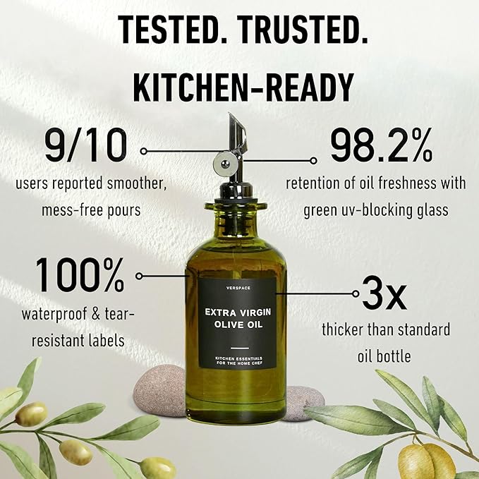 • PROTECT YOUR OIL IN STYLE: This elegant green olive oil bottle set is crafted from UV-blocking glass to preserve flavor, nutrients, and freshness. Whether you're storing extra virgin olive oil or avocado oil, your oils stay safe from sunlight and oxidation.