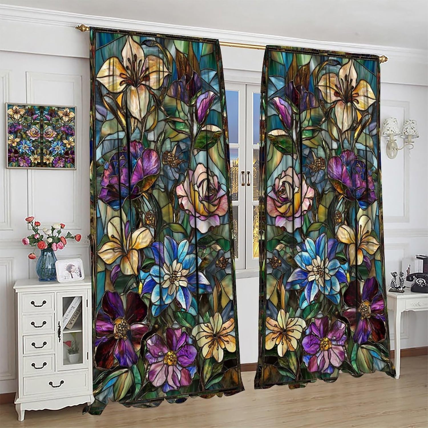 Stained Glass Curtains,Retro Colored Glass Flowers Art Home Decor Drapes for Bedroom Living Room Kitchen Window Treatment 2 Panels Set Total Size 84" W X 84" L Inch