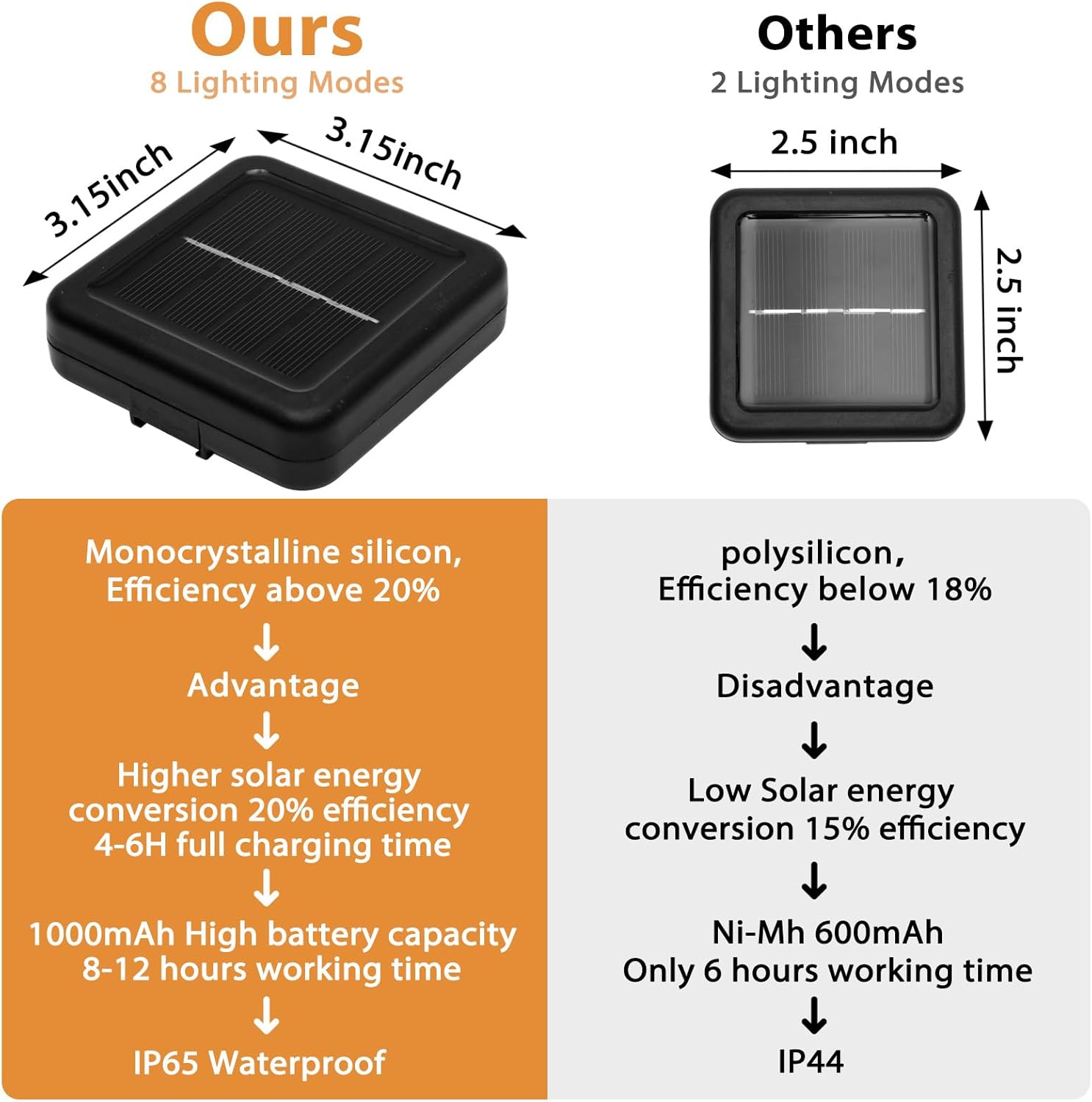 • 【Upgraded Solar Panel & Large Capacity Battery】Solar string lights for outside are equipped with precision 180 degree adjustable 3.15x3.15inch monocrystalline silicon solar panels,built-in 1000mAh large capacity battery,lights up for all night (8-12 hours) after fully charged .