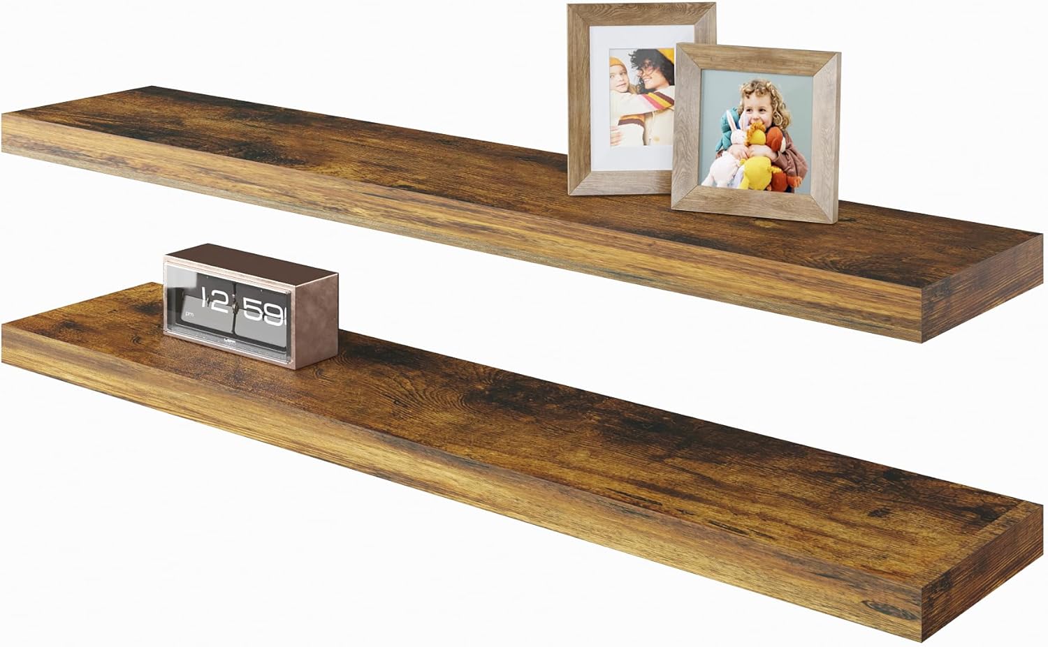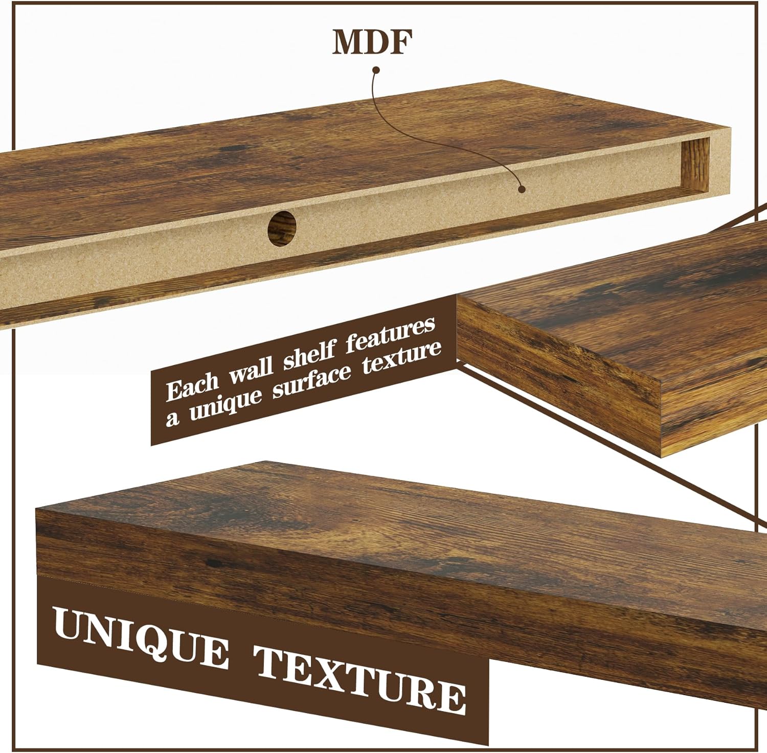 • GREAT FOR ANY ROOM: Our wood floating shelves are made of MDF with a frosted surface texture for a mordern feel that blends perfectly into a variety of different scenes; Having this large floating shelf not only for its decoration effect, but also for its high practicality; It can be used for organizing all household rooms, such as bedroom, living room, study, toilet, cloakroom, even kitchen and warehouse