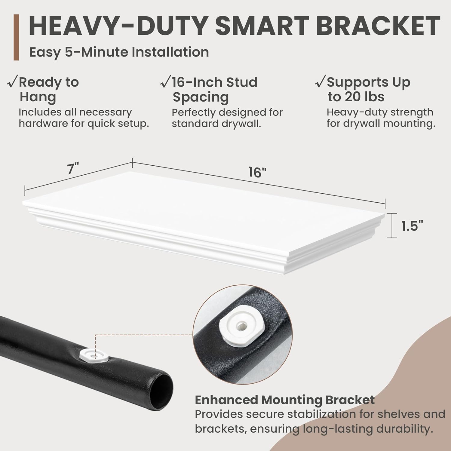 • Package Contents: 1 white floating shelf included, board dimension: 15.8" W x 6.9" D x 1.5" H. Other accessories: 1 metal brackets, 1 magnetic level, 3 wood iron connection screws, 6 wall screws and expansion tubes, and 1 installation manual
