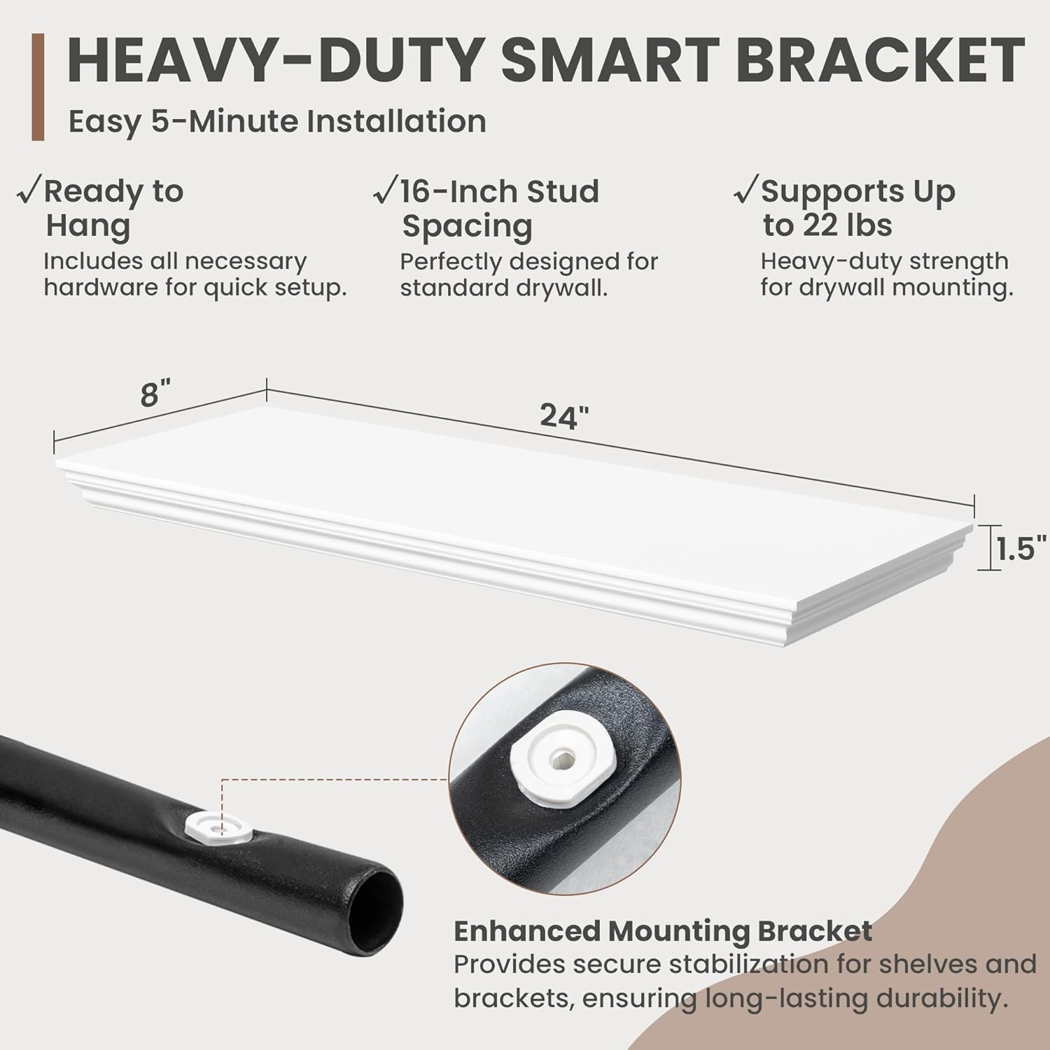 • Strong Suppoot: MDF wooden floating shelf with reinforced brackets supports heavy items effortlessly, holding up to 22 pounds. Hanging shelf's bracket has been preset with a 2° elevation to remain level and not sag after bearing heavy loads
