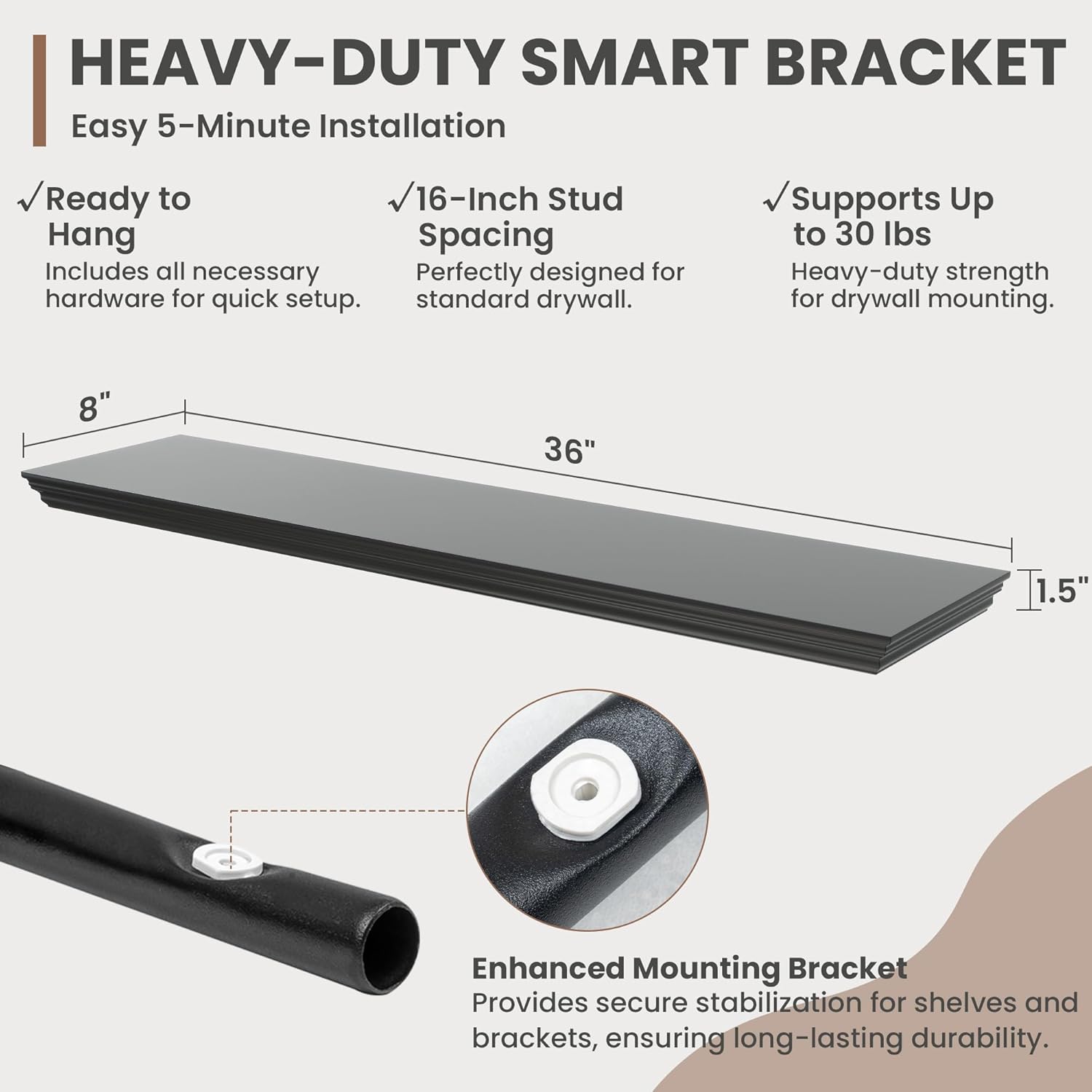 • Package Contents: 1 black floating shelf included, board dimension: 35.5" W x 7.9" D x 1.5" H. Other accessories: 1 metal brackets, 1 magnetic level, 3 wood iron connection screws, 8 wall screws and expansion tubes, and 1 installation manual