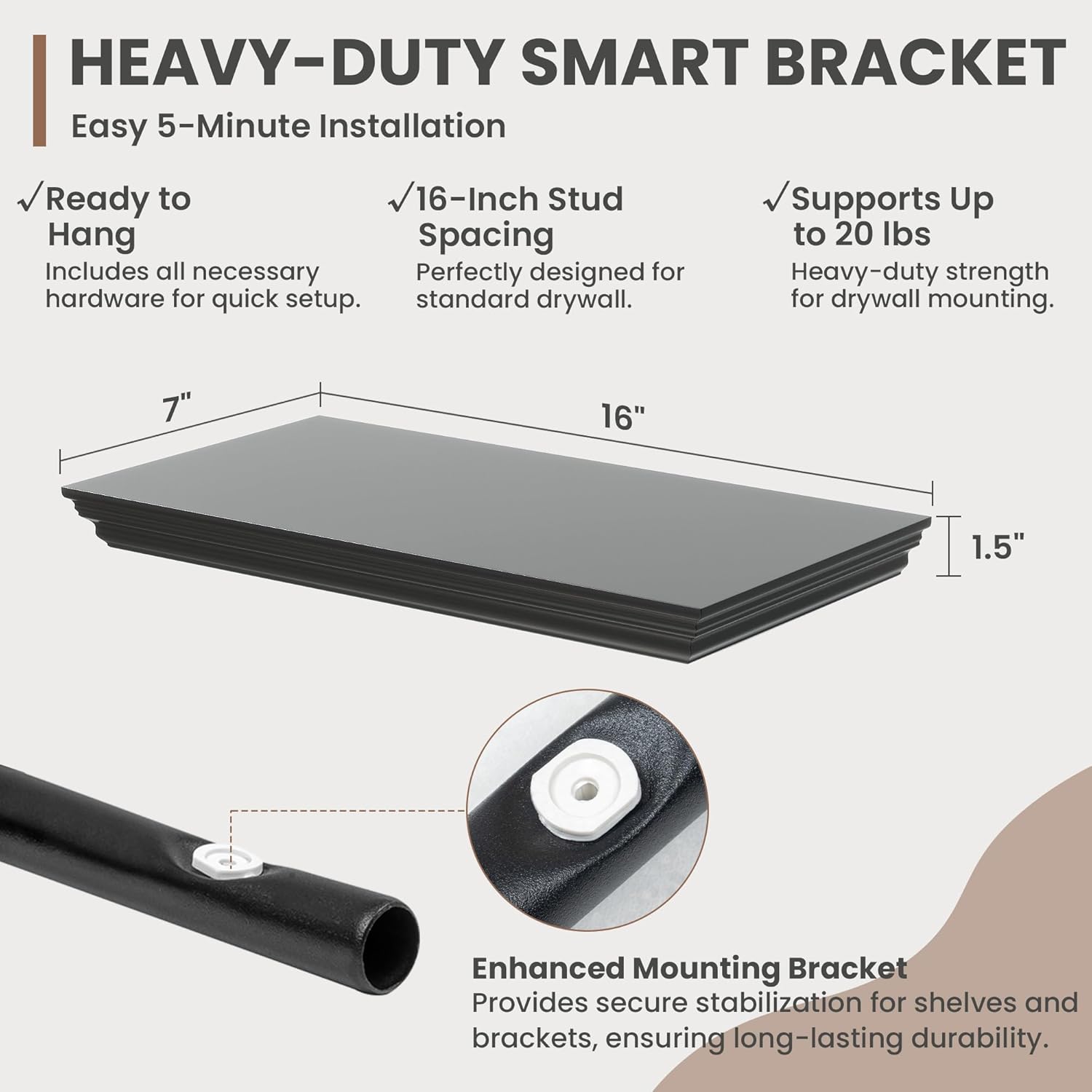 • Package Contents: 1 black floating shelf included, board dimension: 15.8" W x 6.9" D x 1.5" H. Other accessories: 1 metal brackets, 1 magnetic level, 3 wood iron connection screws, 6 wall screws and expansion tubes, and 1 installation manual