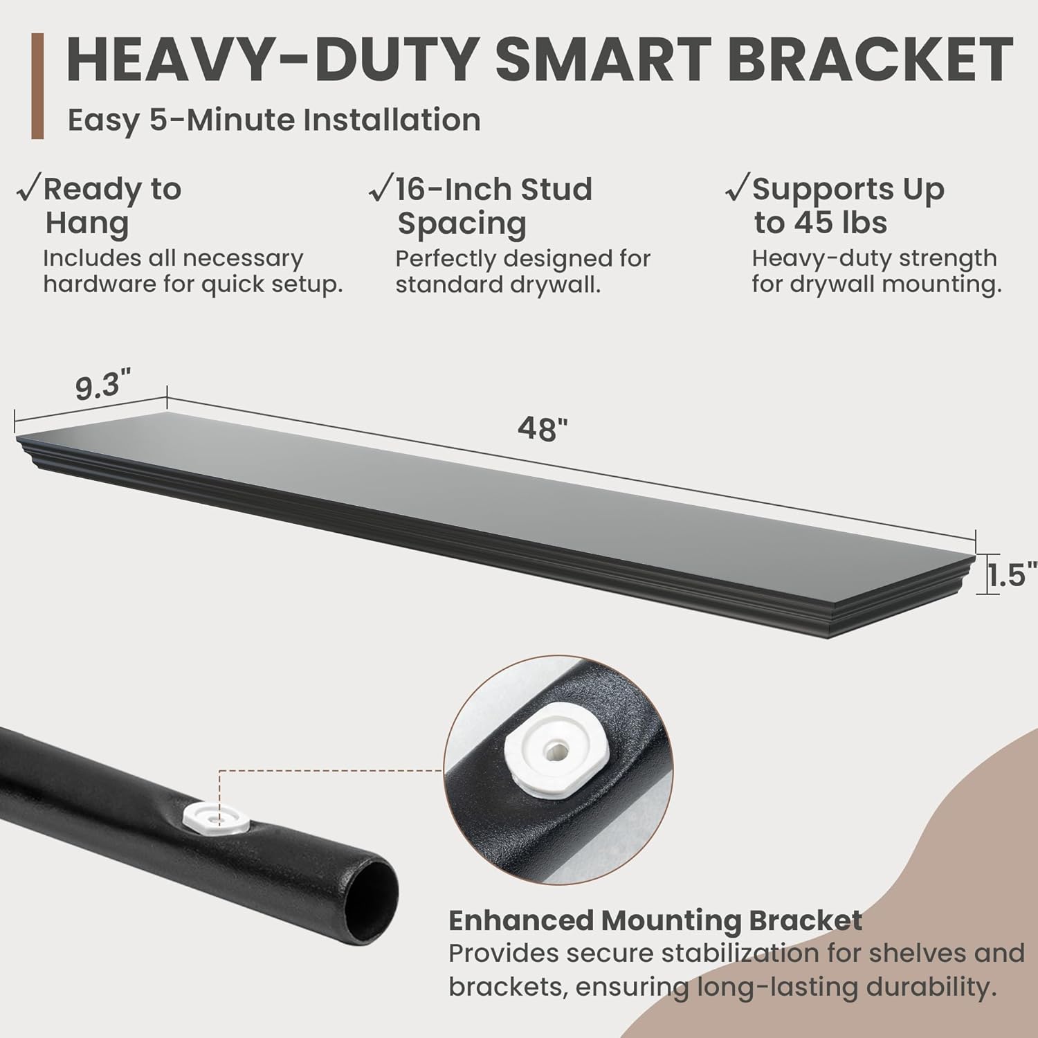 • Package Contents: 1 black floating shelf included, board dimension: 47.3"Wide x 9.3" Deep x 1.5" Height. Other accessories: 1 metal brackets, 1 magnetic level, 3 wood iron connection screws, 9 wall screws and expansion tubes, and 1 installation manual