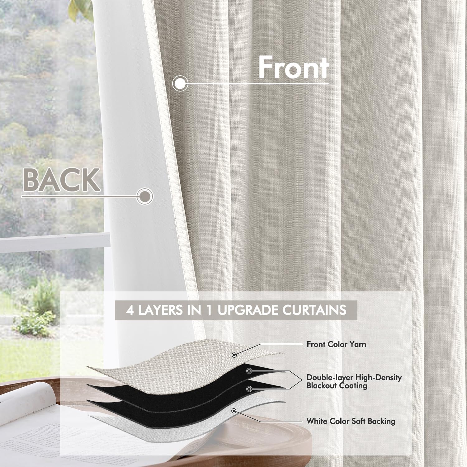 • INNOVATED MATERIAL: Crafted from premium thick linen-like fabric with a substantial weight of 350 GSM, these curtains surpass standard blackout options in thickness, luxurious texture, and functionality. The advanced four-layer coating ensures 100% light blocking, insulation against heat and cold, and effective noise reduction. The vintage burlap texture adds timeless charm and highlights their high-quality feel. Energy-efficient and durable, they provide privacy and a cozy atmosphere year-round