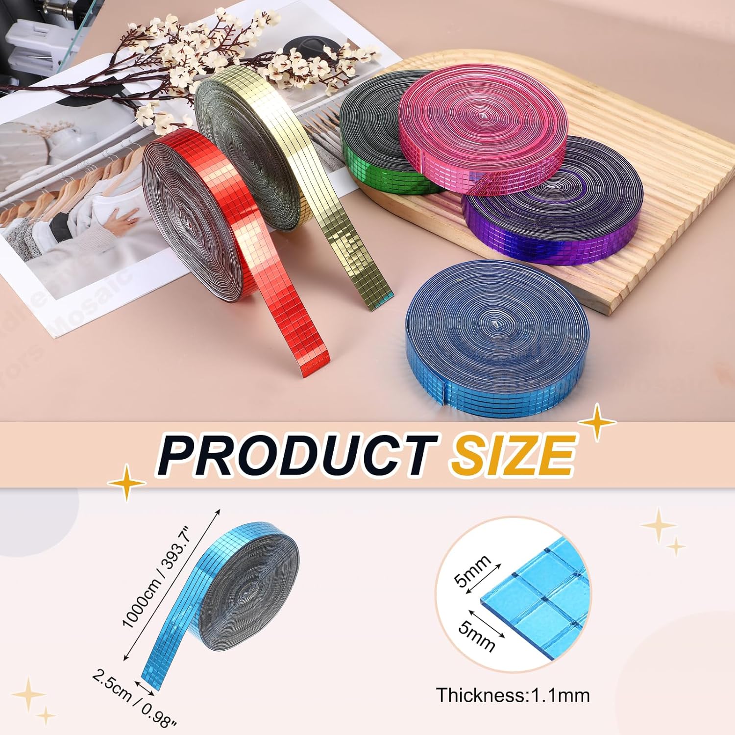 • Specification: Color: Light Blue; Material: Glass; Size:1000x2.5cm/393.7x0.98Inch(LxW); Thickness:1.1mm/0.04inch; Each Tile Size: 5x5mm/0.2x0.2inch; Packing List: 10000 Pcs x Self Adhesive Mirrors Mosaic Tiles (Roll of 1)