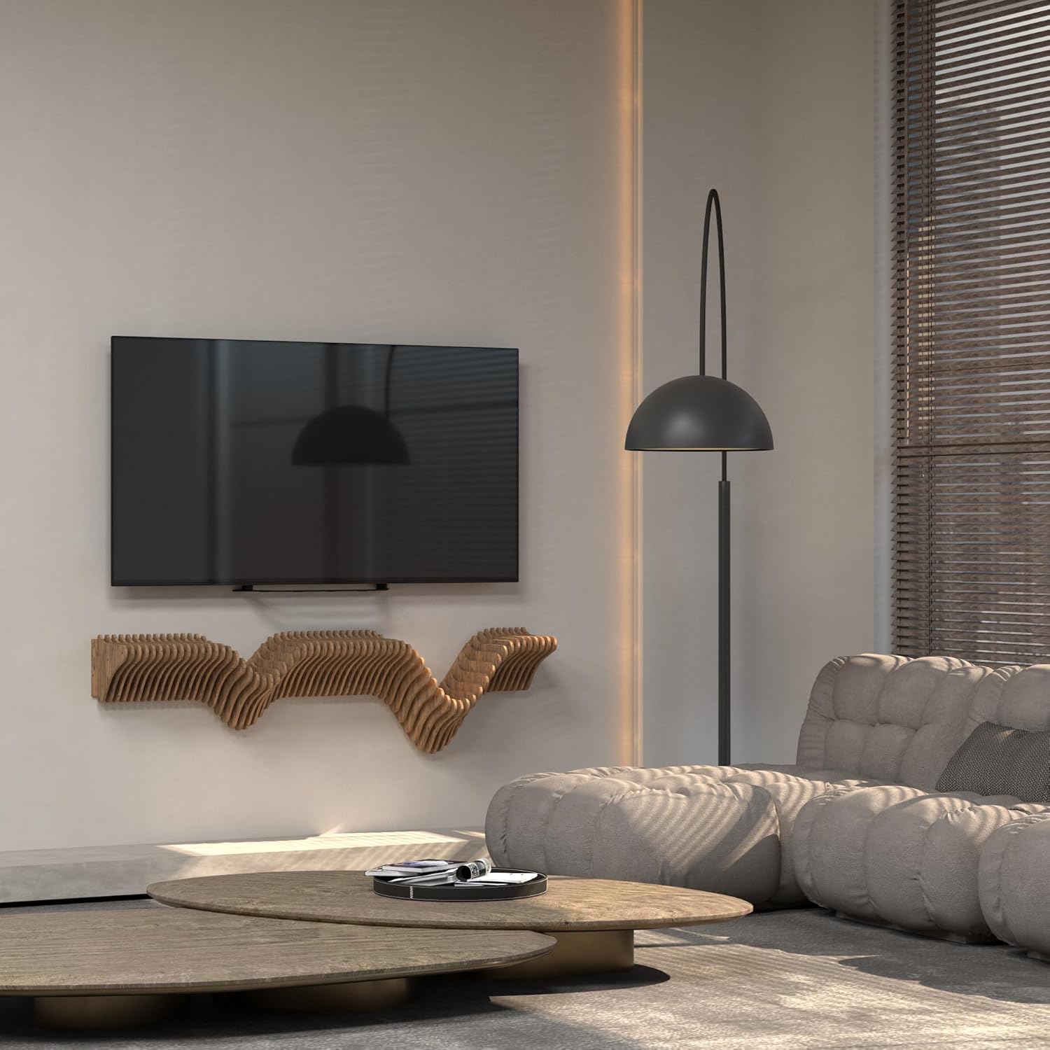 • Upgrade your space with the Batamex 40" Wavy Parametric Shelf - where art meets function! This stunning parametric design works as a TV stand, display shelf, or floating console, adding instant modern flair.
