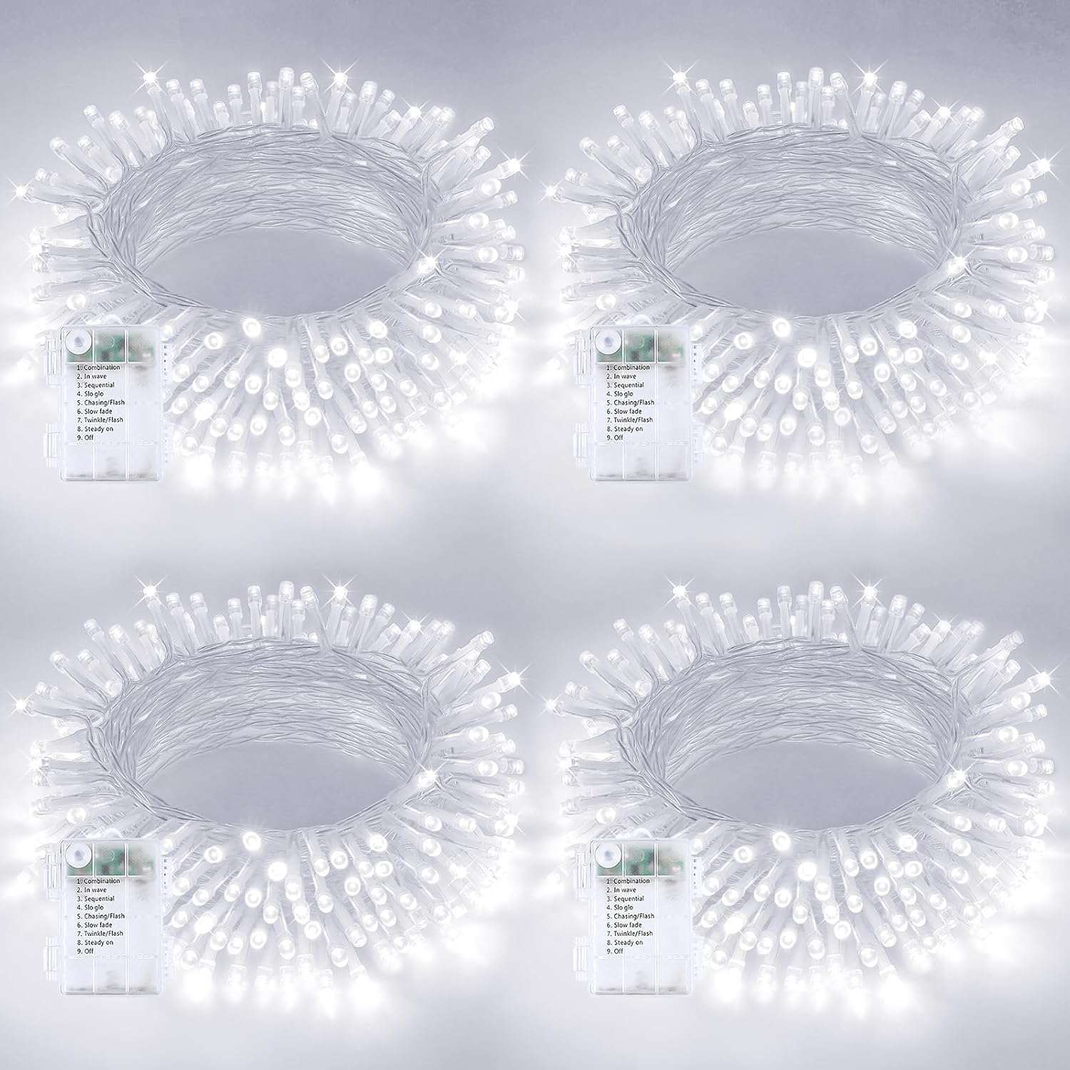 4 Pack String Lights Battery Operated with Timer, 66FT 200 LED Waterproof Battery Twinkle Lights, 8 Modes Fairy Light for Indoor & Outdoor Party Bedroom Garland Tree Christmas Decorations (Cool White)