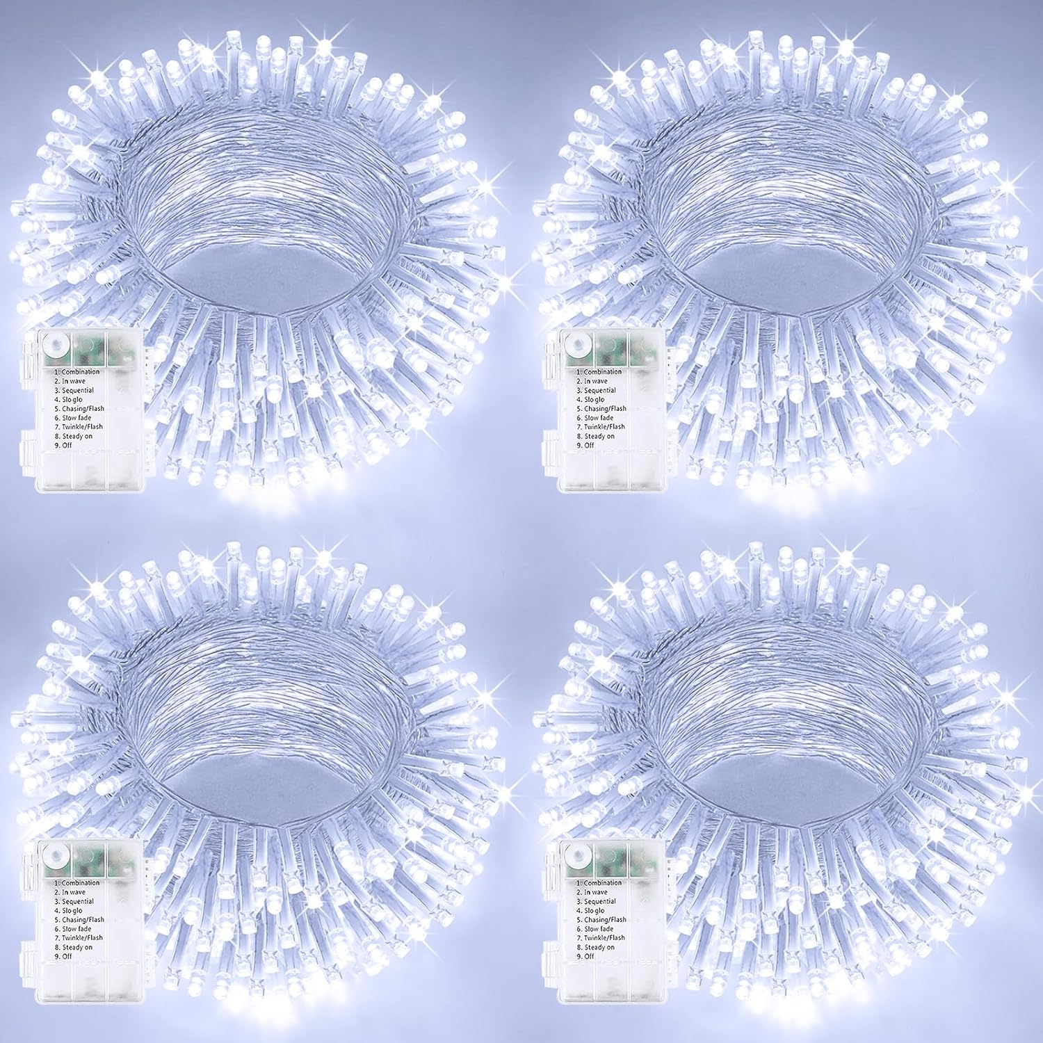 4 Pack String Lights Battery Operated with Timer, 132FT 400 LED Waterproof Battery Twinkle Lights, 8 Modes Fairy Light for Indoor Outdoor Party Bedroom Garland Tree Christmas Decorations (Cool White)