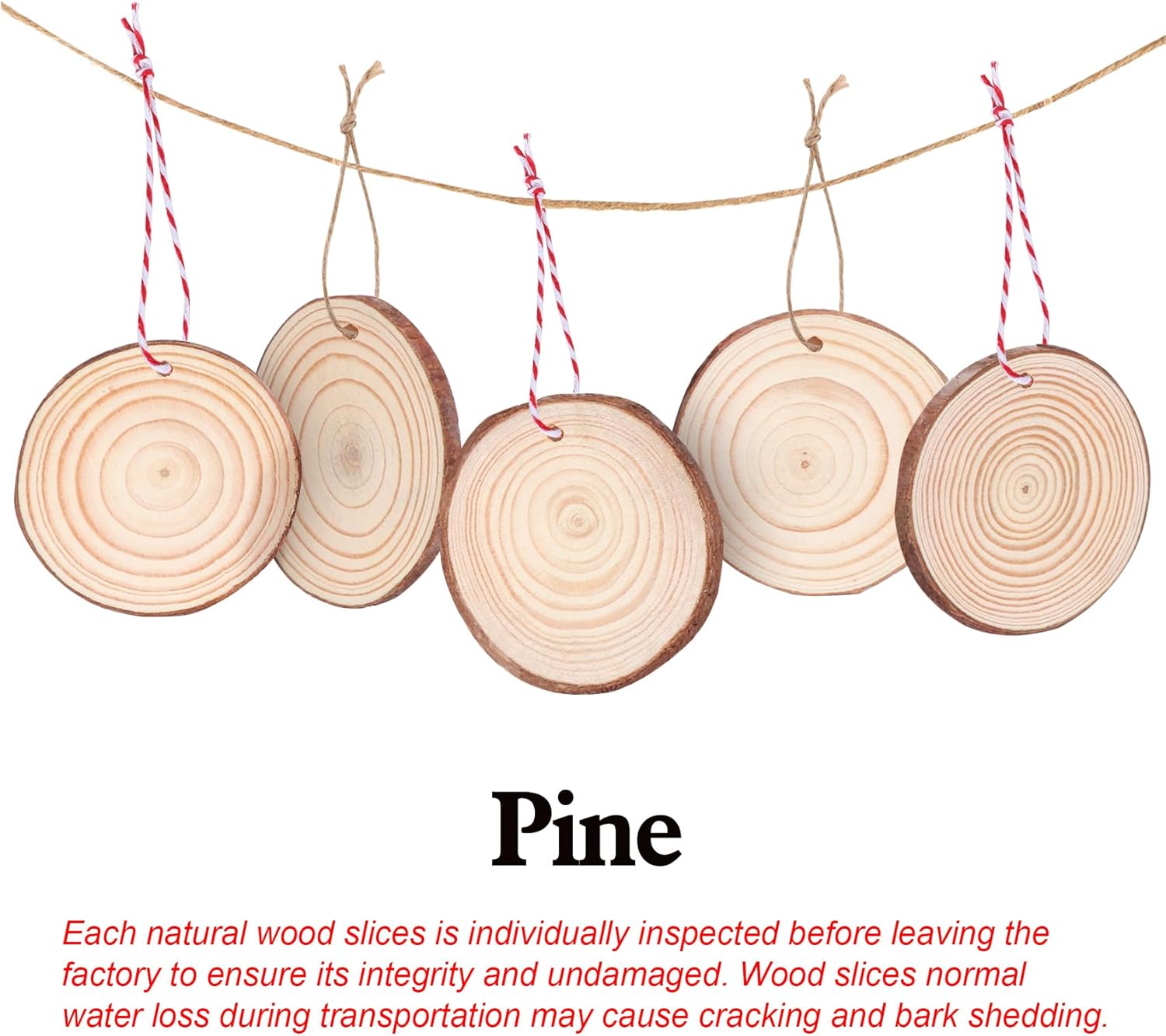 • Premium Quality wood slice: The wood slice are made of pine wood with a sturdy structure, durable and detailed grain, after natural air-drying and sanding treatment, the surface of the wood chips is clear, smooth and burr-free, which makes them ideal for all kinds of DIY handicrafts. The perforated pieces of wood slice can be hung directly from the decoration to create unique small gifts with DIY creativity.