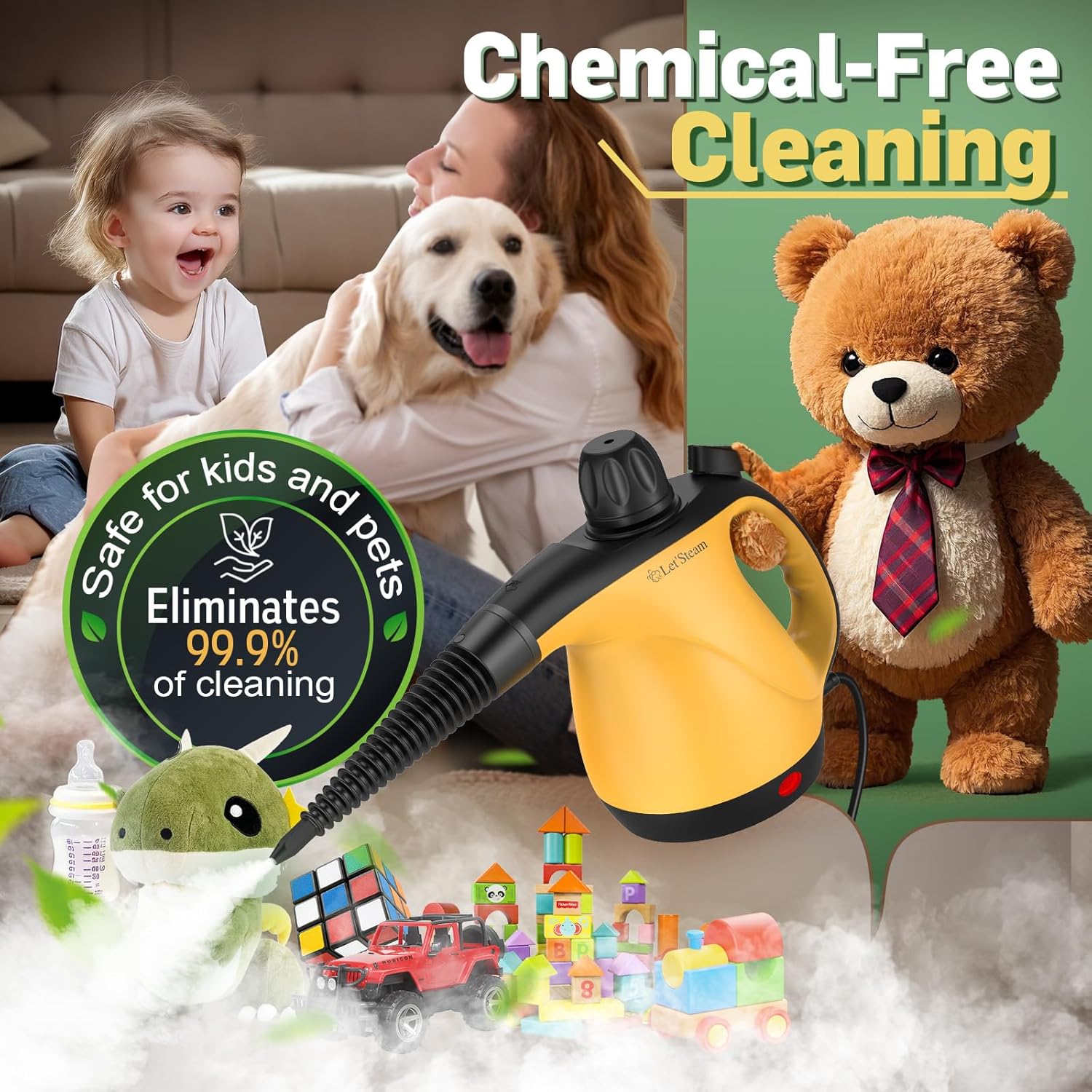 • 【All Natural & No Chemical Steam Cleaner】Experience natural cleaning with our steamer for cleaning! which produces steam by heating water added to the device. This hand held steamer is chemical-free, ensuring a safe and friendly environment for kids, pets, and elderly family members.