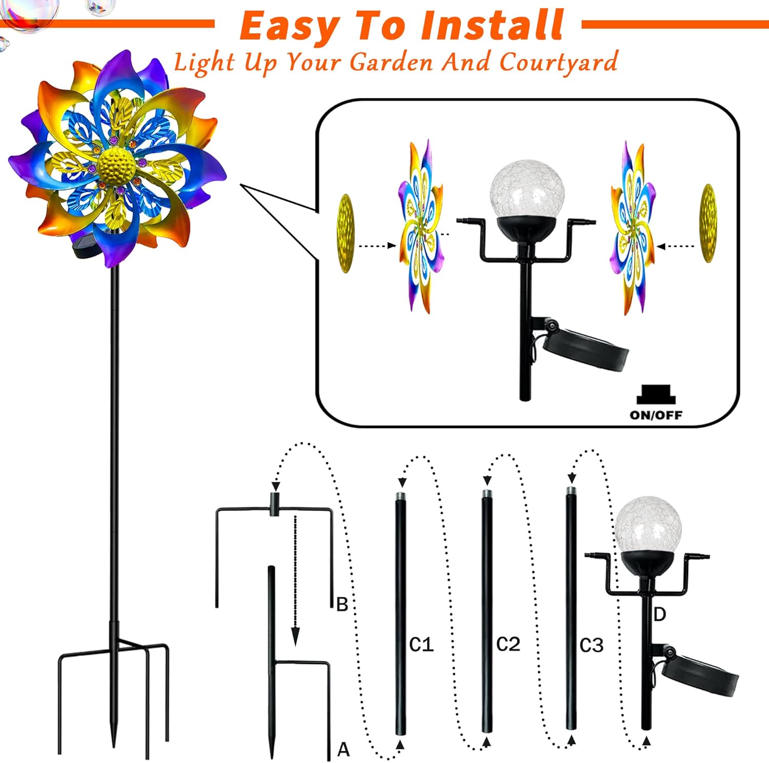 • Vibrant Double-Sided Solar Design: Our 60-inch Solar Wind Spinner Outdoor captures sunlight by day and glows elegantly at night, transforming your garden into a mesmerizing display. Perfect as yard decorations outdoor, these kinetic wind spinners outdoor add dynamic color and movement to any space.