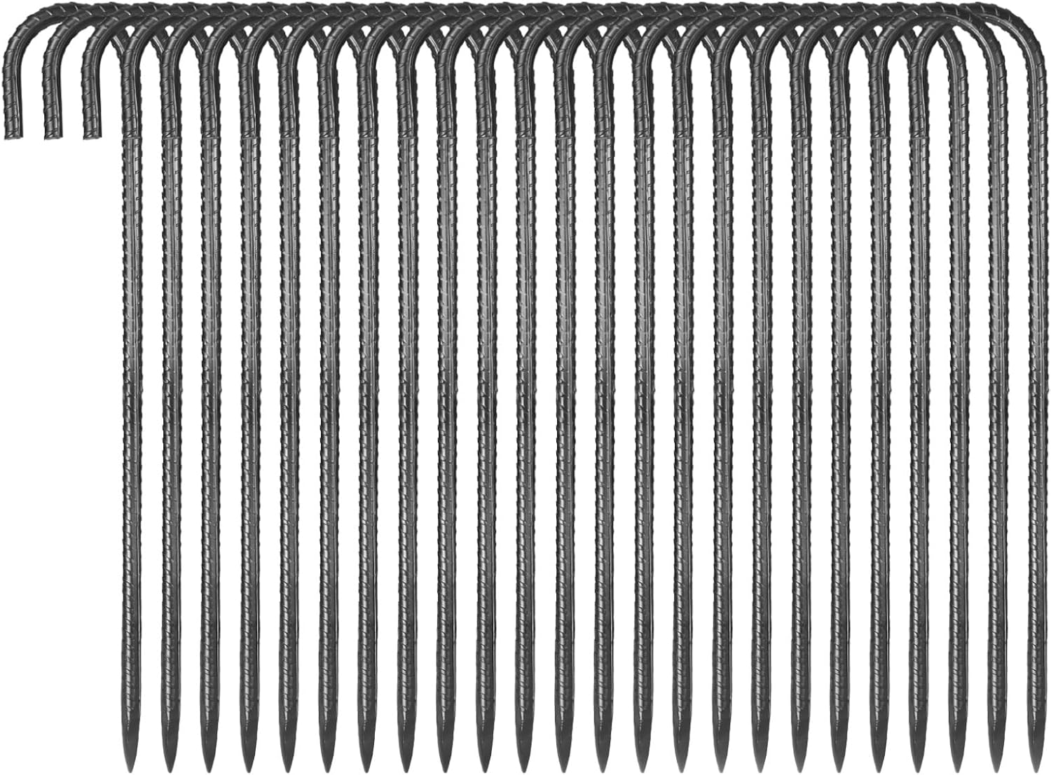 • Extended & Reinforced Design: 16-inch J hook rebar stakes features thick 0.4-inch diameter and comes in a 24-pack bundle. The extended length provides deeper anchoring and stronger pull resistance, ideal for high winds and tough terrain