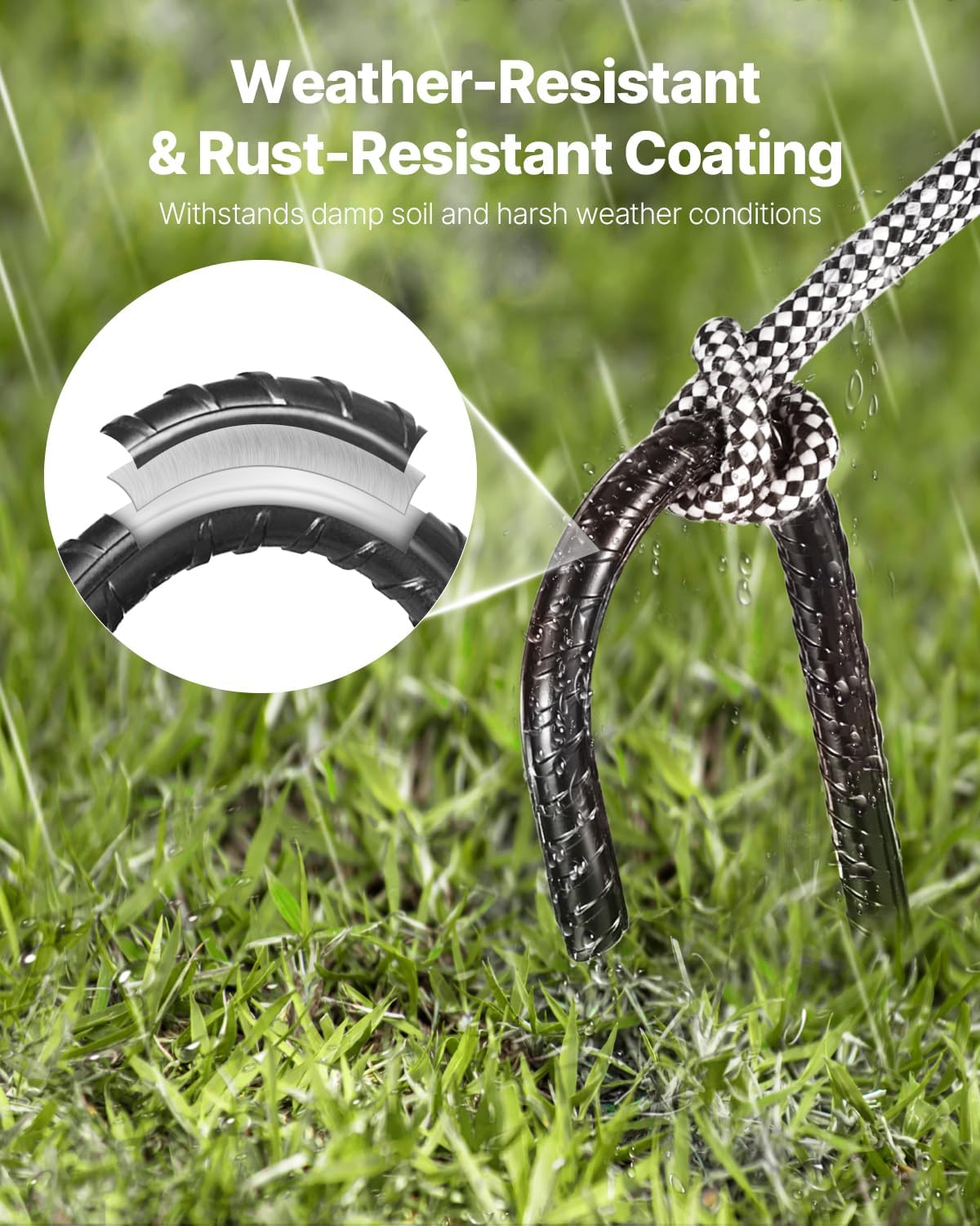 • Durable Galvanized Steel: Built with HRB400E galvanized steel core & black powder coating, these rebar stakes provide double rust protection. They maintain long-term strength while in harsh conditions like damp & salty-alkaline soil, and sun exposure