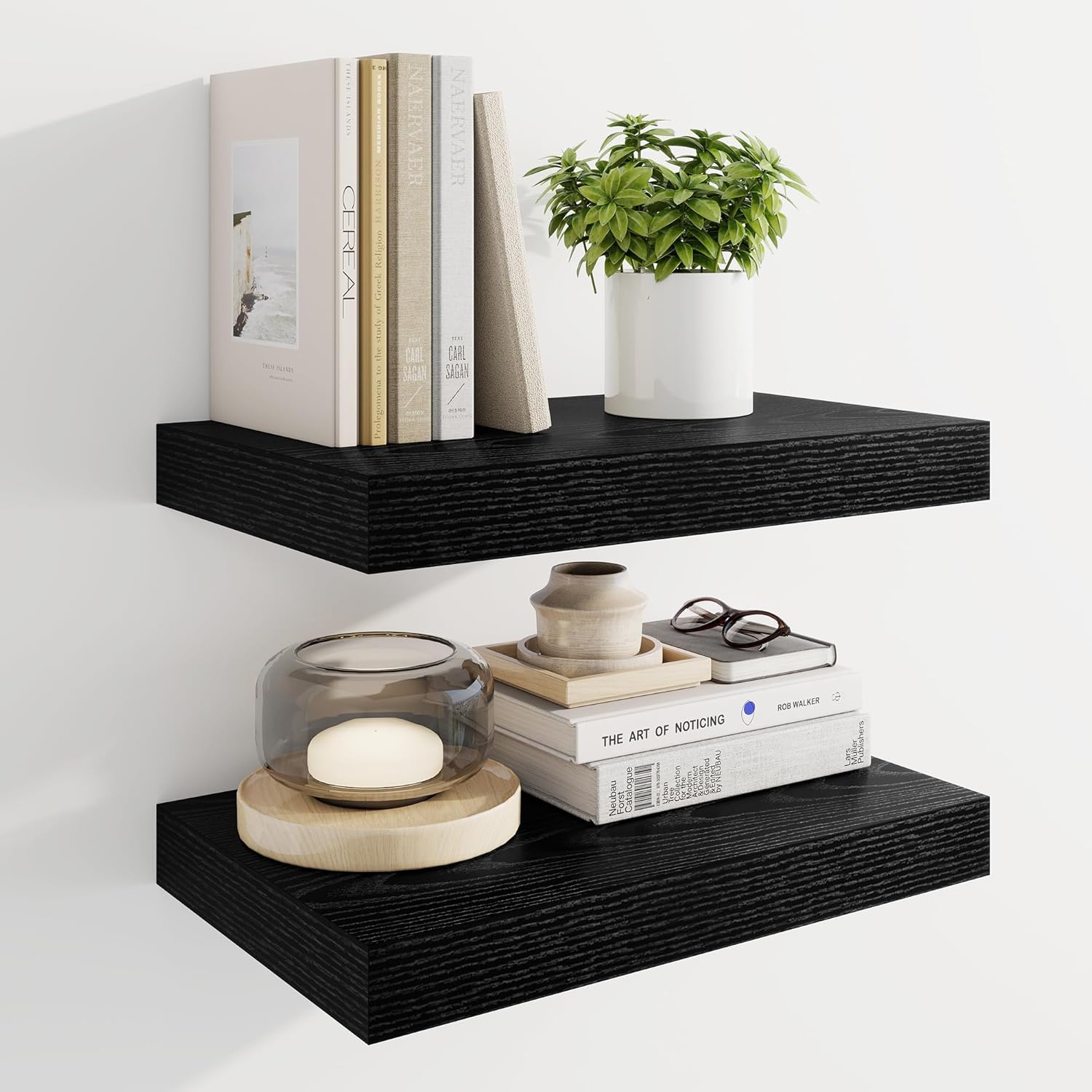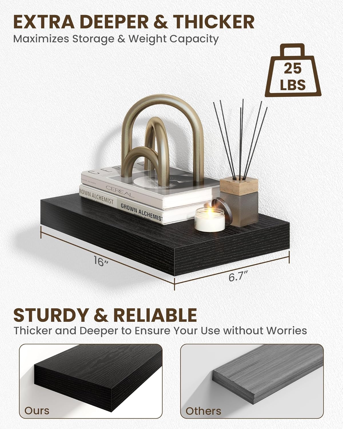 Marsmiles 16" Floating Shelves for Wall, Wooden Shelves with Invisible Brackets Set of 2, Rustic Farmhouse Wall Mounted Shelf for Kitchen Bathroom Living Room Study, Black