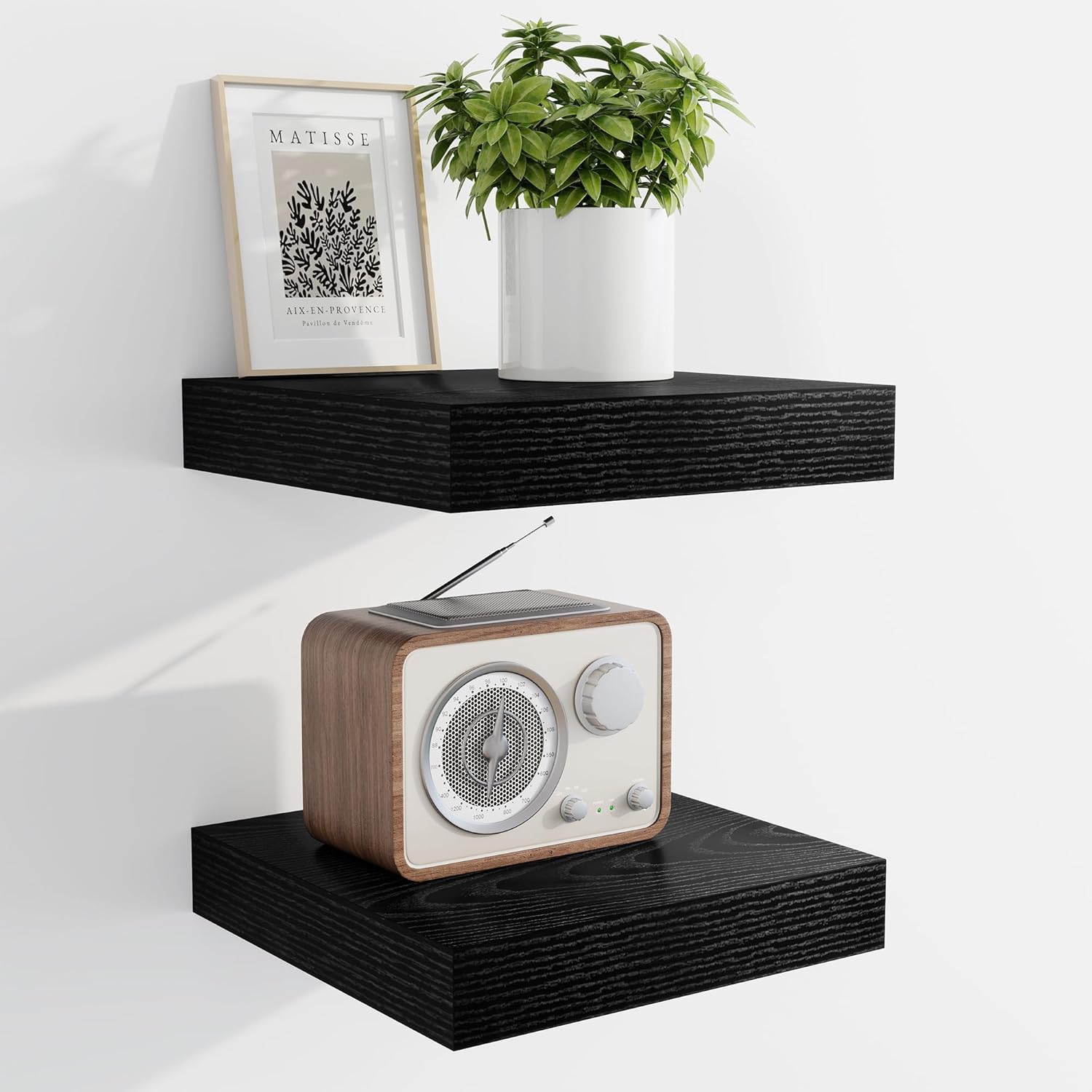 Marsmiles 6.7" Floating Shelves for Wall, Wooden Shelves with Invisible Brackets Set of 2, Rustic Farmhouse Wall Mounted Shelf for Kitchen Bathroom Living Room Study, Black