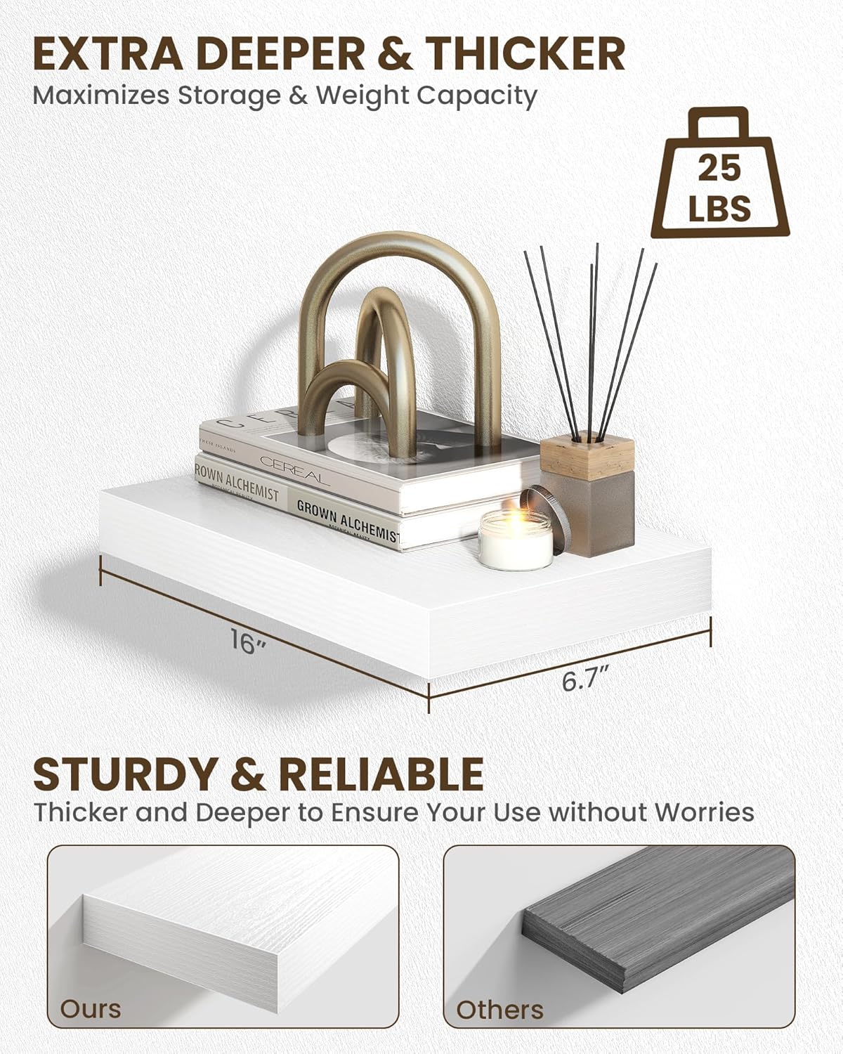 Marsmiles 16" Floating Shelves for Wall, Wooden Shelves with Invisible Brackets Set of 2, Rustic Farmhouse Wall Mounted Shelf for Kitchen Bathroom Living Room Study, White