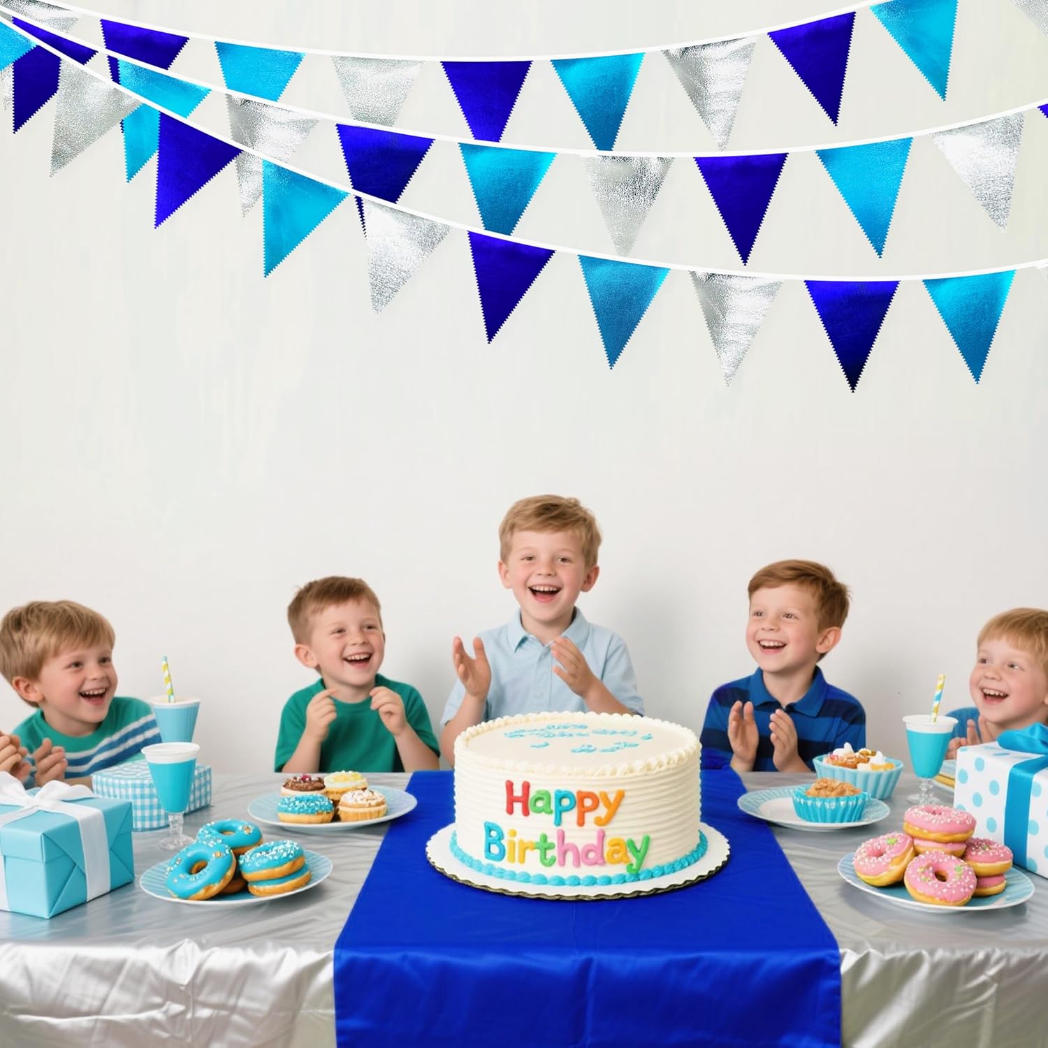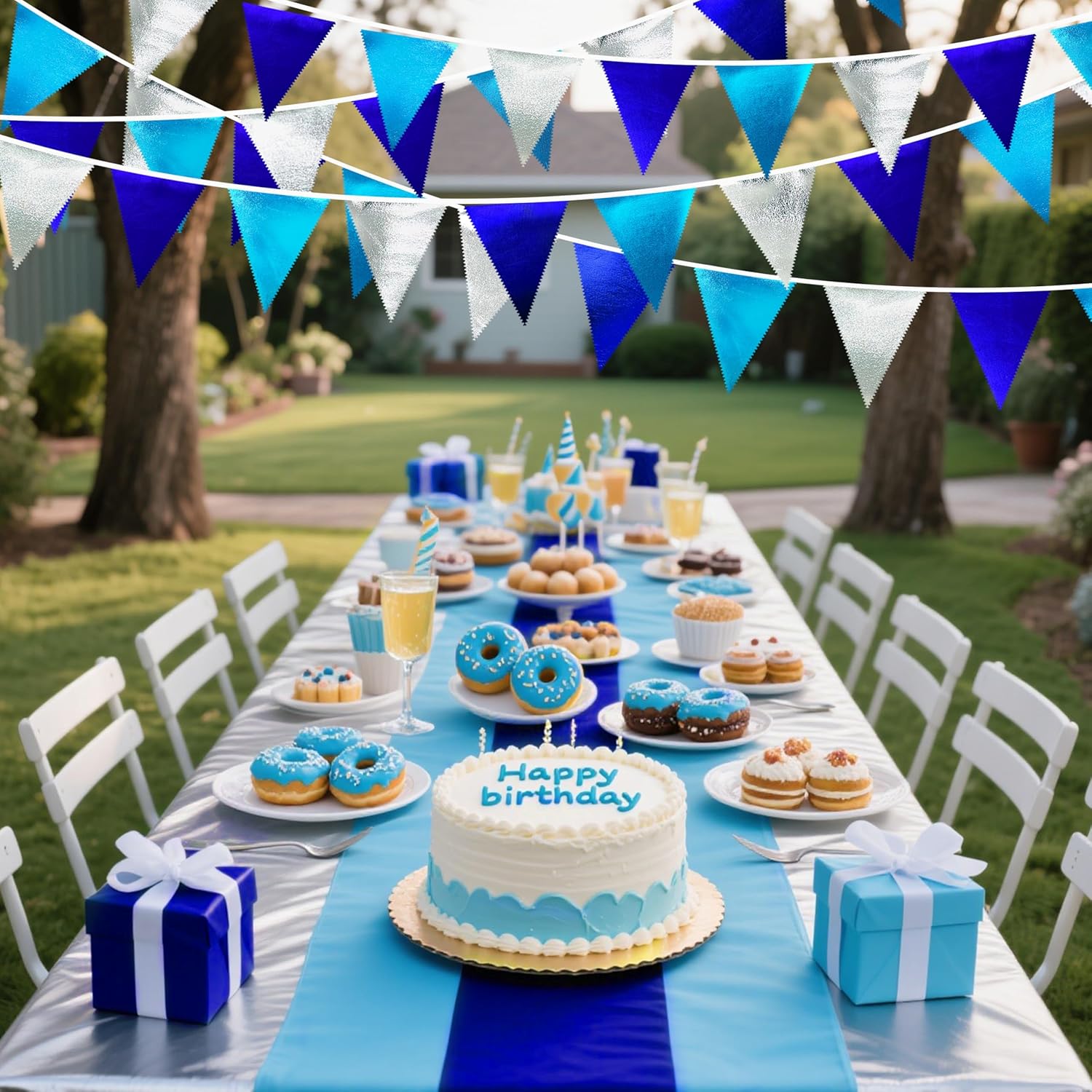 • Environmental Material - Our triangle flag banner bunting are made of double-sided sky blue、royal blue、silve metallic fabric cloth,Unique wavy neat cut,soft and comfortable touch.safe and odorless,washable and waterproof,durable and reusable.