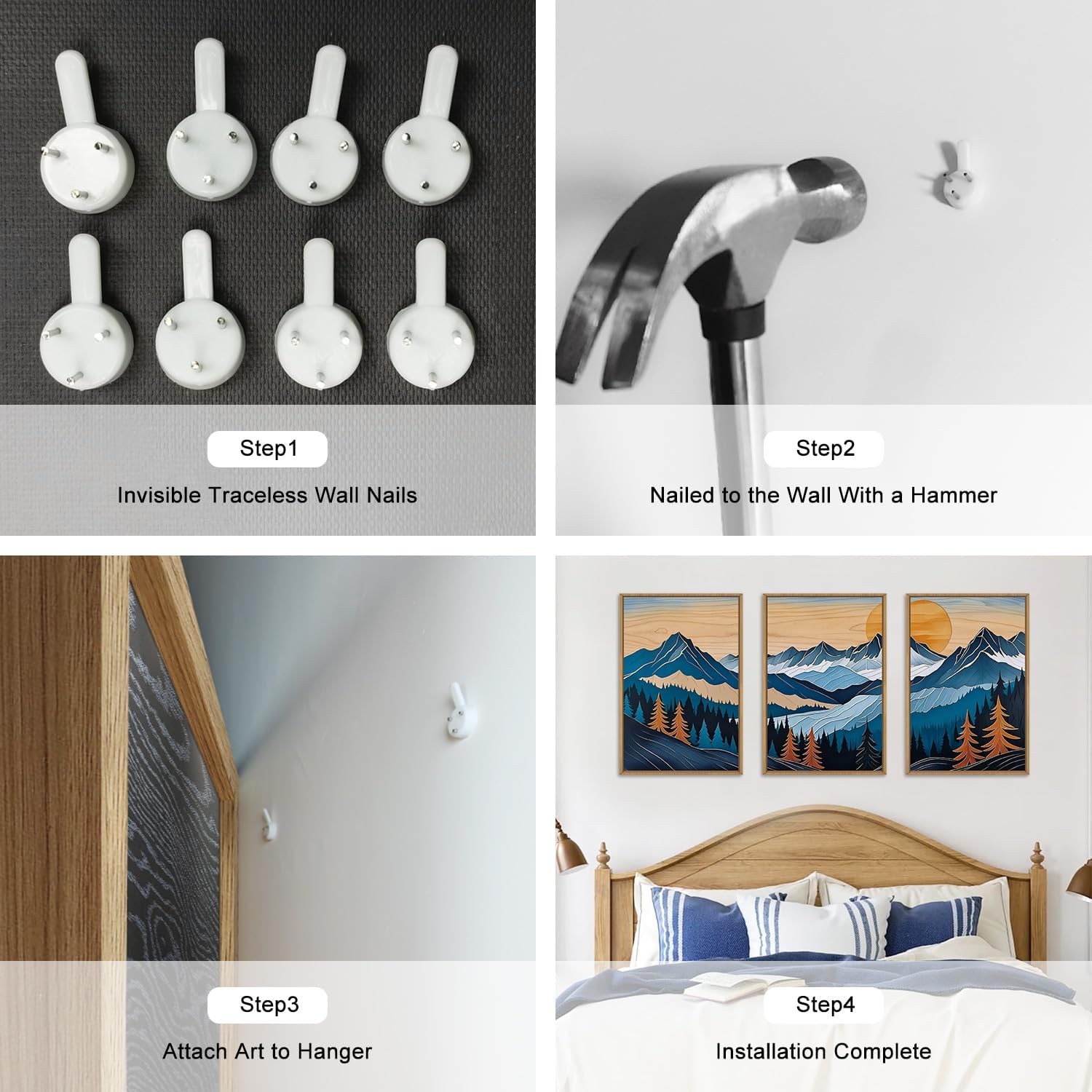 • 【Blue Woodcut Mountain Wall Art Set】This blue woodcut mountain framed canvas wall art set executed in a charming nature style, captures mountains and trees, evoking an poetic atmosphere. Its modern organic aesthetic is reminiscent of nature charm. Utilizing this artwork as part of your decor will make your room full of poetry.