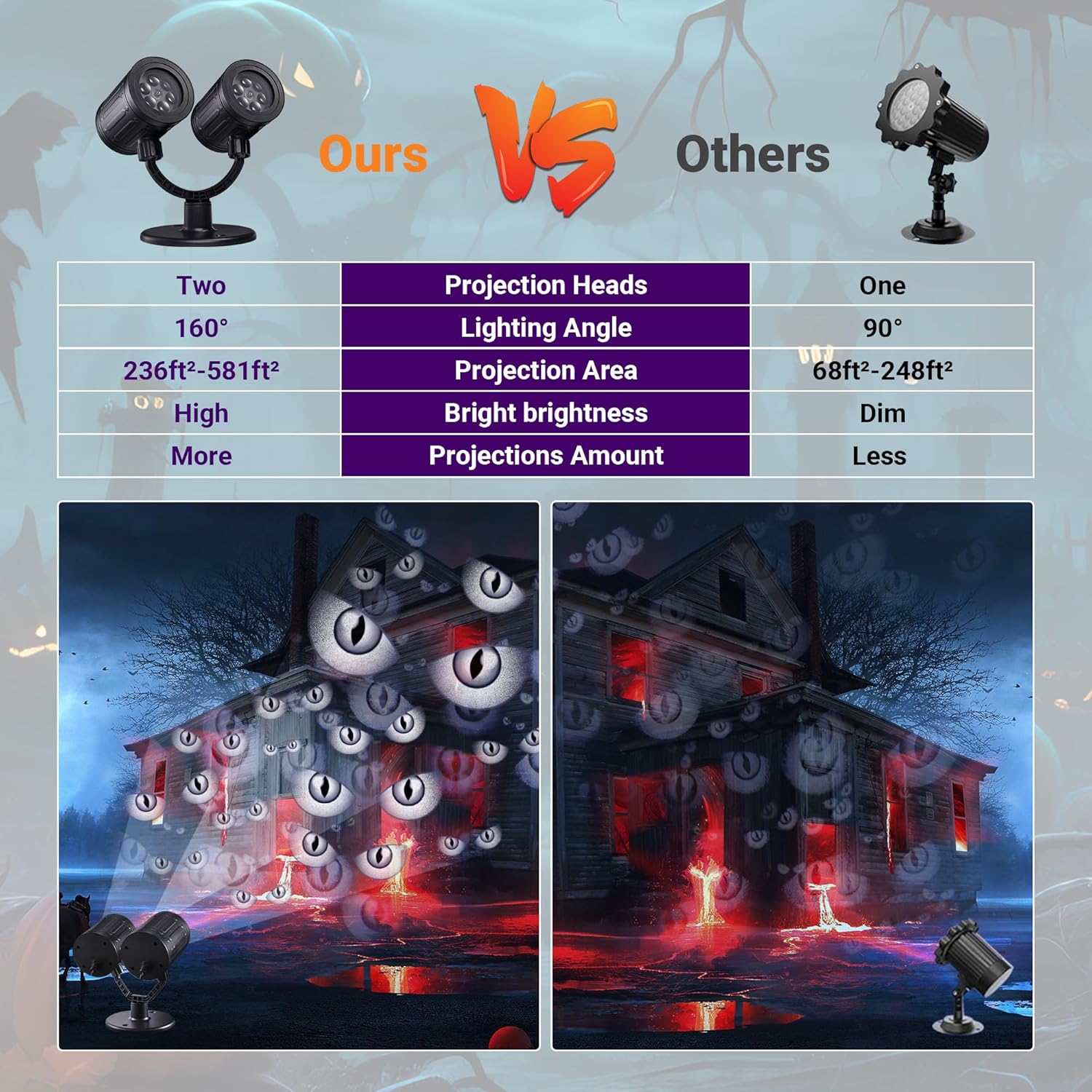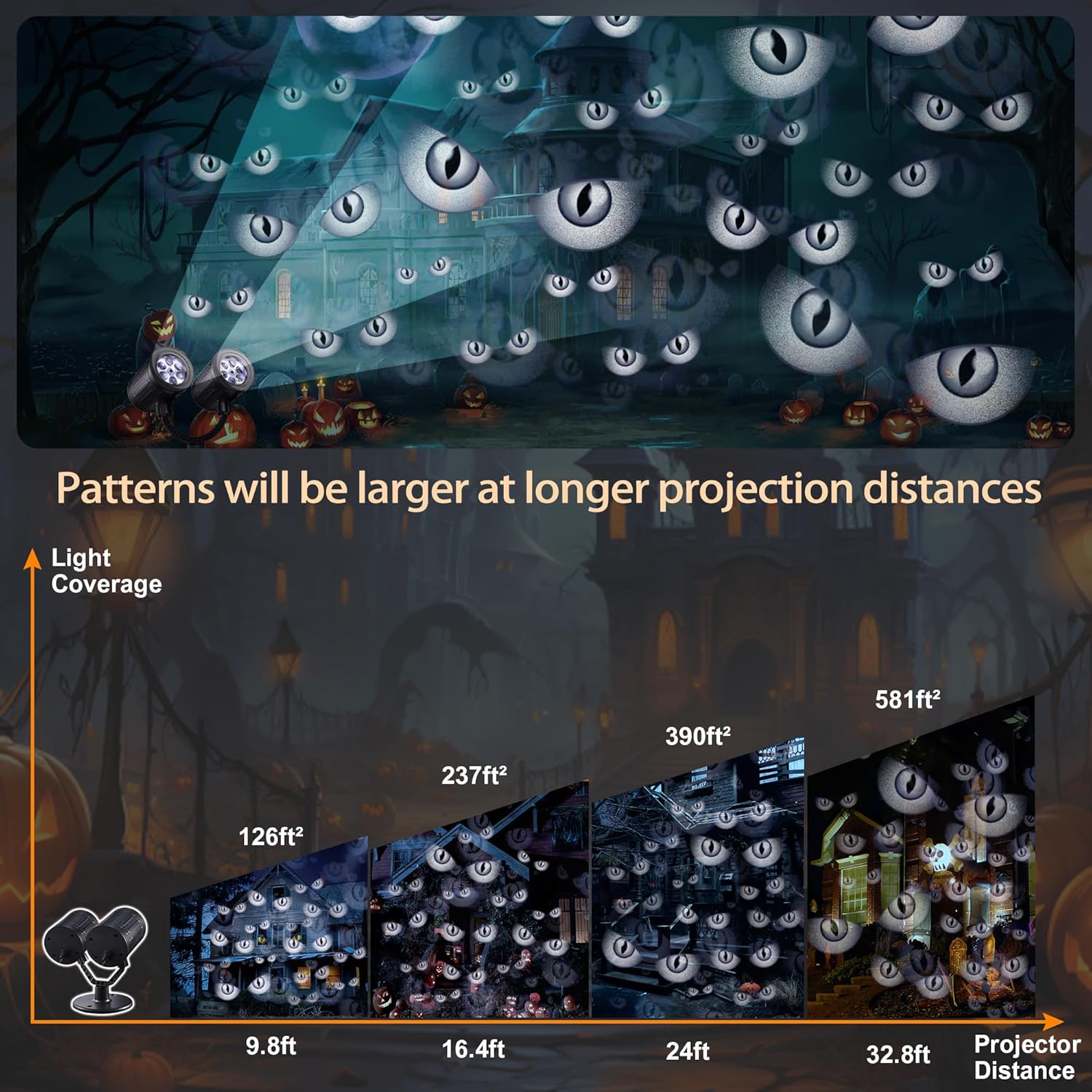 • 3-in-1 Decorations Projector: The Halloween Projector come with ground stake, base device, wall base screws, can be used for outdoor and indoor decorations. With 9.8ft lead cable, you can place the Halloween lights projector on flat surface, or mount it in ground, or mount it on wall, and it will give you an amazing Halloween atmosphere. It is recommended to place the projector at 16.4ft - 33ft for best result.