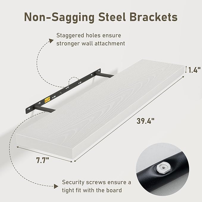 • 40 Inch Floating Shelves for Wall (Set of 2): Each wall shelves are 8 inches in depth and 1.4 inches in thickness. 2-piece set is more cost-effective and practical. Our wall shelf can be used in combination, staggered high or low on the wall, or mounted side-by-side to provide extra storage space for organizing small items and clutter in multiple areas such as kitchens, bathrooms, and bedrooms, creating a clean and smooth look. Multiple colors available