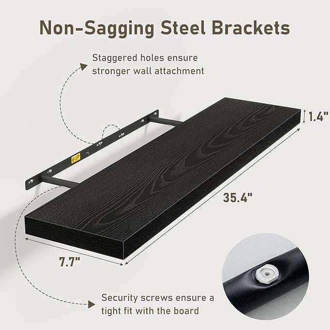 • 36 Inch Floating Shelves for Wall (Set of 2): Each wall shelves are 8 inches in depth and 1.4 inches in thickness. 2-piece set is more cost-effective and practical. Our wall shelf can be used in combination, staggered high or low on the wall, or mounted side-by-side to provide extra storage space for organizing small items and clutter in multiple areas such as kitchens, bathrooms, and bedrooms, creating a clean and smooth look. Multiple colors available