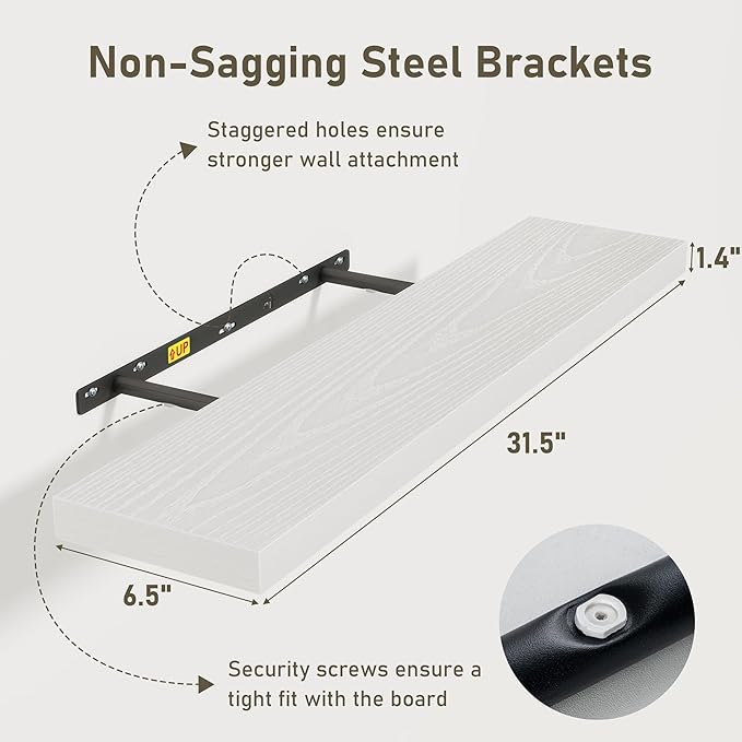 • 32 Inch Floating Shelves for Wall (Set of 3): Each wall shelves are 6.7 inches in depth and 1.4 inches in thickness. 3-piece set is more cost-effective and practical. Our wall shelf can be used in combination, staggered high or low on the wall, or mounted side-by-side to provide extra storage space for organizing small items and clutter in multiple areas such as kitchens, bathrooms, and bedrooms, creating a clean and smooth look. Multiple colors available