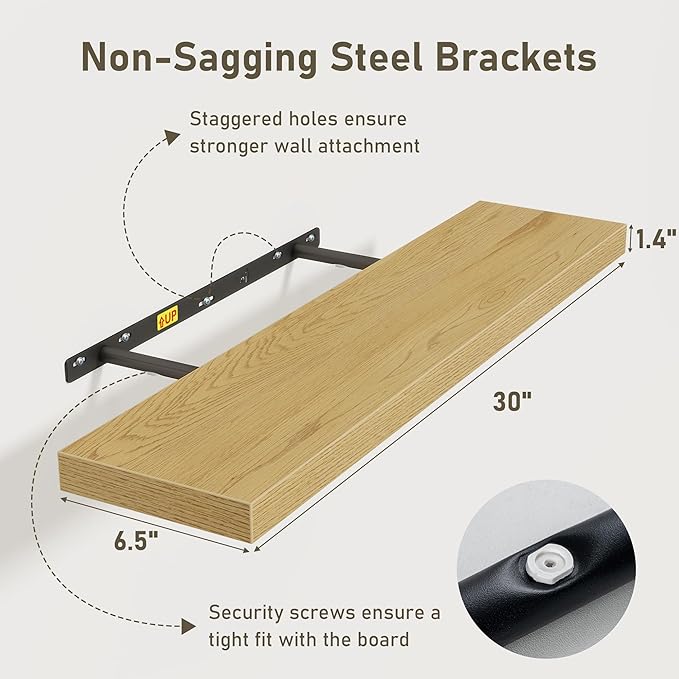 • 30 Inch Floating Shelves for Wall (Set of 3): Each wall shelves are 6.7 inches in depth and 1.4 inches in thickness. 3-piece set is more cost-effective and practical. Our wall shelf can be used in combination, staggered high or low on the wall, or mounted side-by-side to provide extra storage space for organizing small items and clutter in multiple areas such as kitchens, bathrooms, and bedrooms, creating a clean and smooth look. Multiple colors available