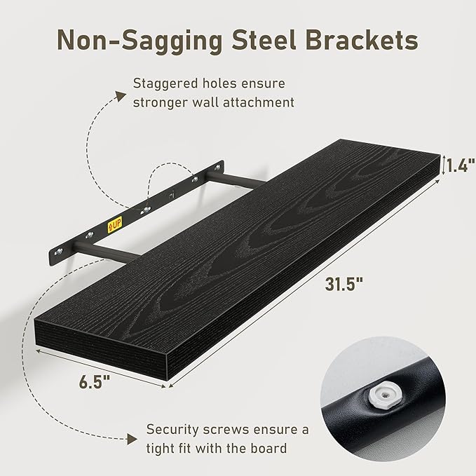 • Easy To Assemble: This floating shelves not only come with stainless-steel galvanized invisible brackets, but also equipped a fixing screw at the bottom to fix the shelf on the support rod, which solves the problem of sliding and is not easy to damage, and can be used for a long time. Instructions, magnetic level, drywall anchors, and screws included. This is great because you can easily mount these rustic shelves Gap-Free to any surface in less than 10 minutes