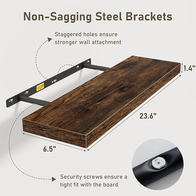 • Easy To Assemble: This floating shelves not only come with stainless-steel galvanized invisible brackets, but also equipped a fixing screw at the bottom to fix the shelf on the support rod, which solves the problem of sliding and is not easy to damage, and can be used for a long time. Instructions, magnetic level, drywall anchors, and screws included. This is great because you can easily mount these rustic shelves Gap-Free to any surface in less than 10 minutes