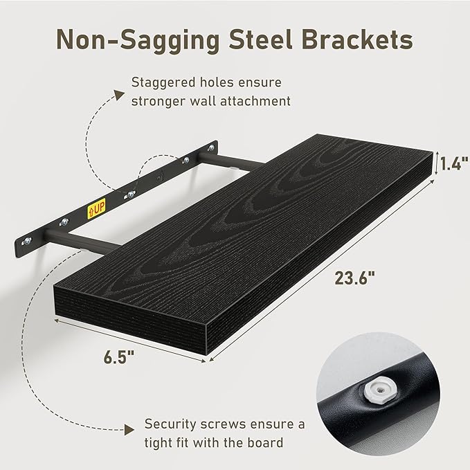 • Easy To Assemble: This floating shelves not only come with stainless-steel galvanized invisible brackets, but also equipped a fixing screw at the bottom to fix the shelf on the support rod, which solves the problem of sliding and is not easy to damage, and can be used for a long time. Instructions, magnetic level, drywall anchors, and screws included. This is great because you can easily mount these rustic shelves Gap-Free to any surface in less than 10 minutes