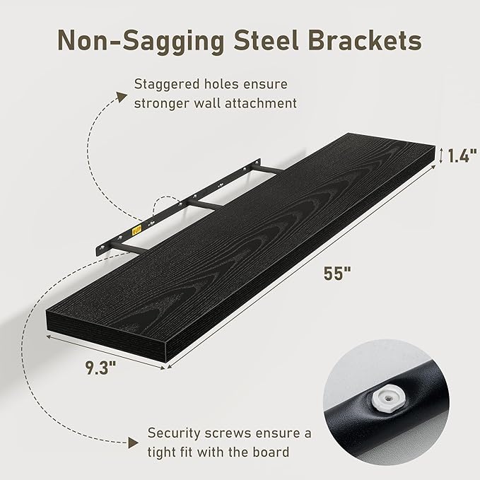 • 55 Inch Floating Shelves for Wall (Set of 2): Each wall shelves are 9.3 inches in depth and 1.4 inches in thickness. 2-piece set is more cost-effective and practical. Our wall shelf can be used in combination, staggered high or low on the wall, or mounted side-by-side to provide extra storage space for organizing small items and clutter in multiple areas such as kitchens, bathrooms, and bedrooms, creating a clean and smooth look. Multiple colors available