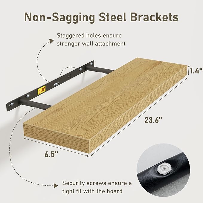 • Easy To Assemble: This floating shelves not only come with stainless-steel galvanized invisible brackets, but also equipped a fixing screw at the bottom to fix the shelf on the support rod, which solves the problem of sliding and is not easy to damage, and can be used for a long time. Instructions, magnetic level, drywall anchors, and screws included. This is great because you can easily mount these rustic shelves Gap-Free to any surface in less than 10 minutes