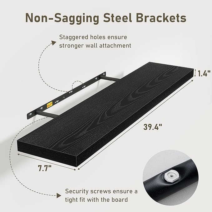 • 40 Inch Floating Shelves for Wall (Set of 2): Each wall shelves are 8 inches in depth and 1.4 inches in thickness. 2-piece set is more cost-effective and practical. Our wall shelf can be used in combination, staggered high or low on the wall, or mounted side-by-side to provide extra storage space for organizing small items and clutter in multiple areas such as kitchens, bathrooms, and bedrooms, creating a clean and smooth look. Multiple colors available