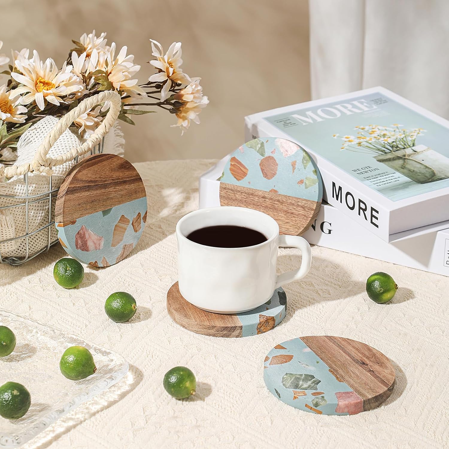 • Natural, Durable Materials: Meticulously crafted from natural acacia wood and genuine marble, these cute cup coasters blend organic warmth with stone elegance. The durable wood resists deformation while the polished marble surface ensures lasting protection, maintaining refined aesthetics through daily use.