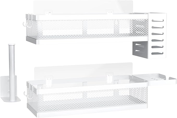 • 【MULTI-PURPOSE&MULTIFUNCTIONAL】5 Hanging Storage Baskets Organizer Set for Sufficient Bathroom Kitchen Storage Space, The bathroom&Kitchen organizer comes with 5 pieces for different uses, including 2 Hanging Storage Baskets, 1 soap holder,1 Tissue holder ,1 utensil holder and 2 adhesives. The perfect solution for organizing a multitude of every items indoor or outdoor. The cabinet organizer hanging baskets wall mount is Ideal for organizing and storing spice bottles, pantry items, snacks, toiletries, tools, craft supplies,etc. And this metal bin basket free up enough space for your homes, kitchen, living room, bathroom, camper, farmhouse, apartments, college dorm rooms, etc.
