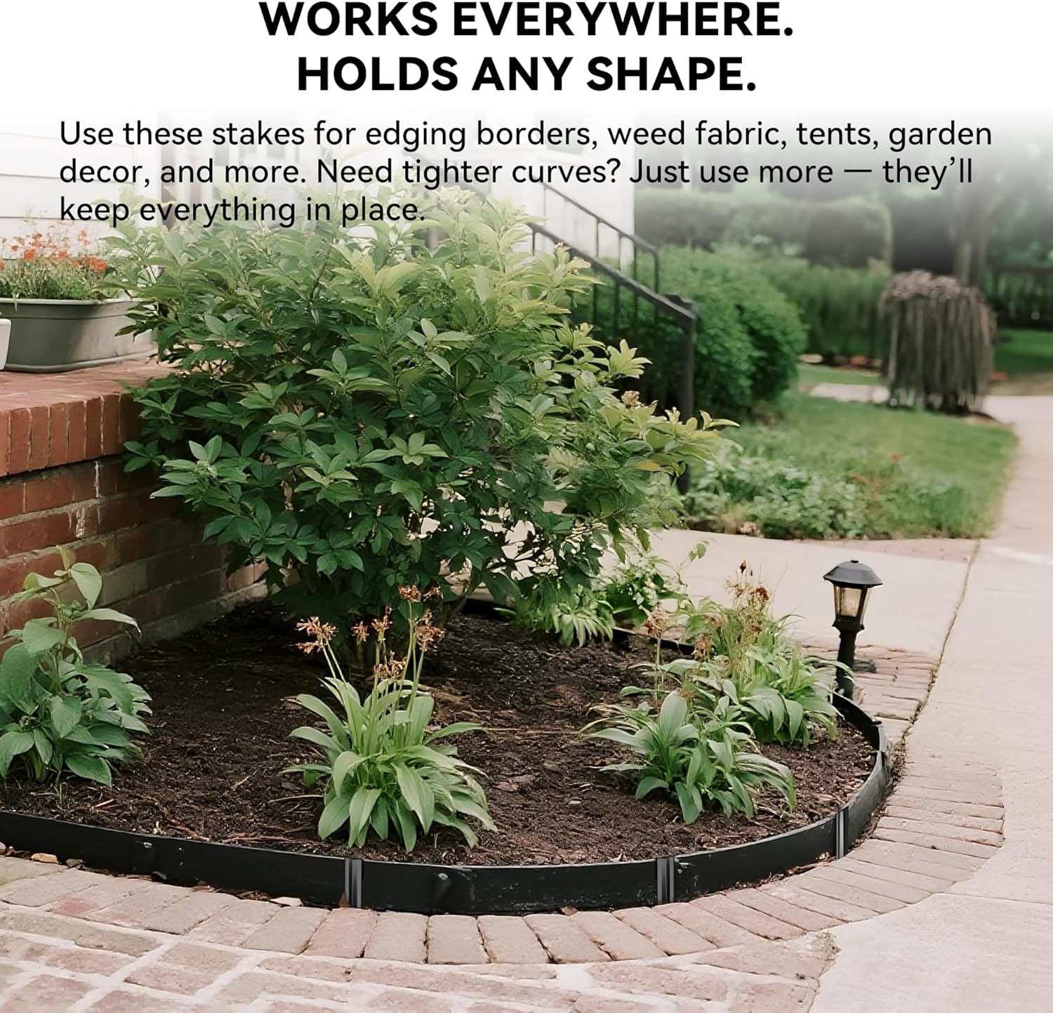 • INNOVATIVE DESIGN: Features a curved shape, the top of landscape edging stakes fits perfectly with edge to provide a stable support.The unique reinforcing rib in the middle significantly enhances the overall strength of the stake, easily solving the problem of looseness.