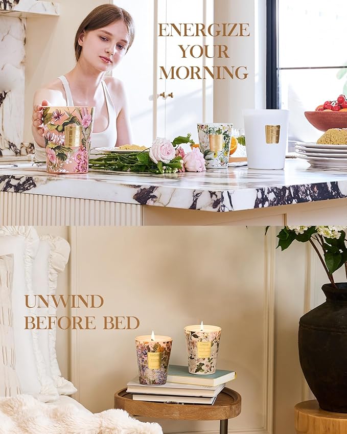 • Aesthetic Jar Candles - The exquisite flower pattern design brings a touch of nature's charm. With the elegant gold sticker, it creates a luxurious and sophisticated look. This makes our candle an ideal choice for home decoration, as it effortlessly enhances the aesthetic appeal of any living space