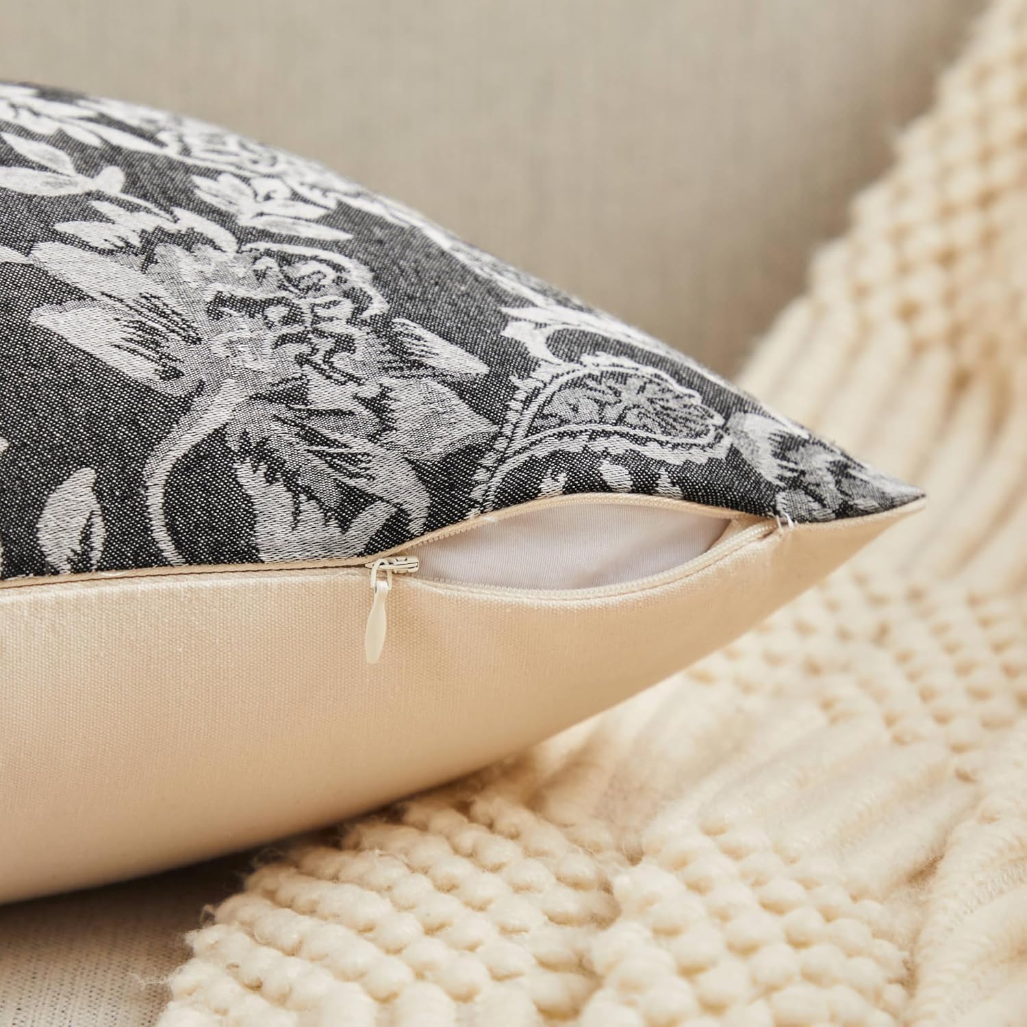 Floral Jacquard Lumbar Throw Pillow Covers Set of 2, Background/Charcoal 12x20 Inch, Farmhouse Decorative Cotton Dark Grey Cushion Covers for Sofa Bed Living Room Home Decor