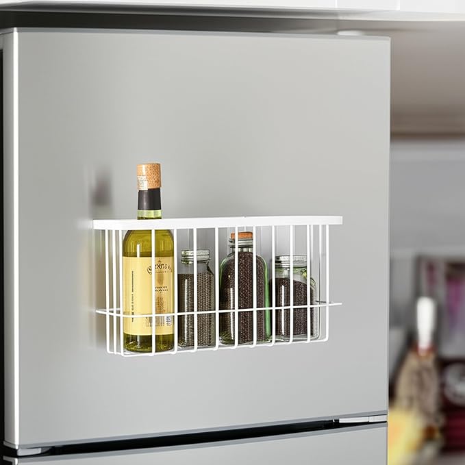 • Magnetic Fridge Organizer: Features large magnetic pad that adhere to refrigerators, washing machines, or file cabinets without damaging surfaces. The magnetic basket blends with any room decor.