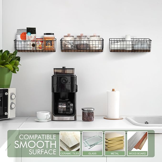 • Flexible Installation - 2 wall mount solutions. Come with adhesive stickers and a screw hook set. The non-trace stickers for holding things below 22 lbs in baskets work with any smooth and clean texture like glass, ceramic, or cabinet. Metal hook screws are available for needs over 44 lbs.