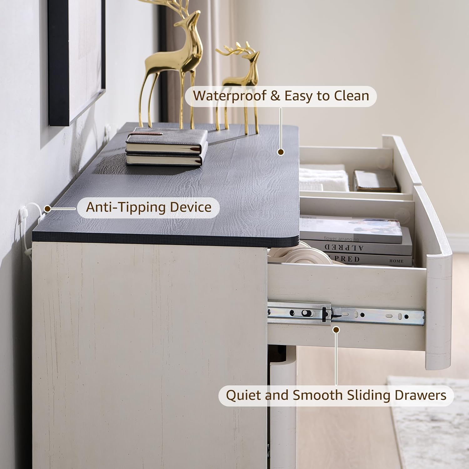 • Handle-Free Design – Clean and modern design,features Push-to-Open drawers for easy and convenient operation.High-quality metal glides ensure quiet and smooth drawer operation. Handle-free convenience—perfect for maintaining a clean, streamlined space.While the rounded edges ensure safety for kids and families.