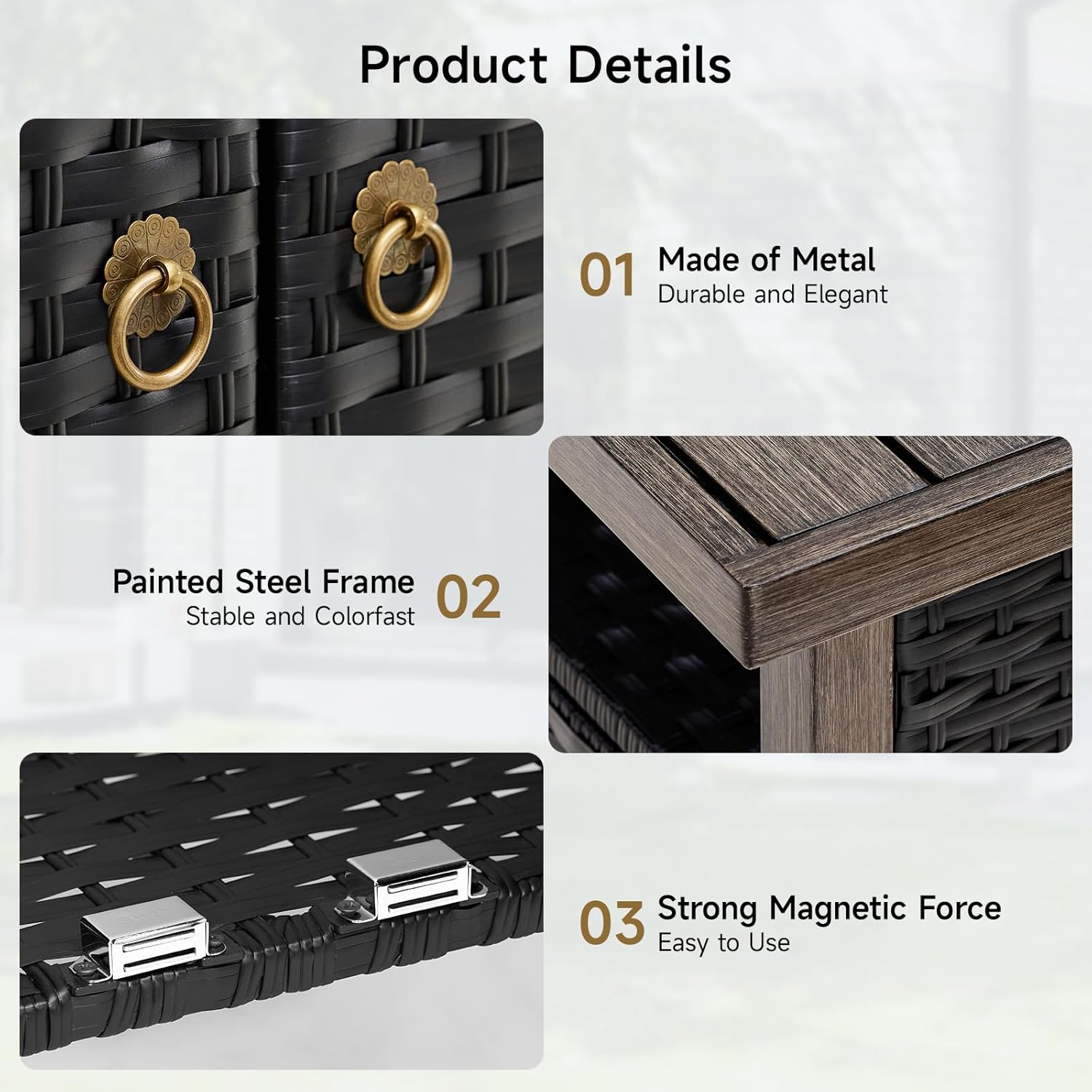 • Details that Make Life Delightful: Uneven floors? Twist the adjustable foot pads for instant stability! The magnetic doors click shut with satisfying precision, saying goodbye to items dropping, while the aged bronze rings add vintage flair, make this rattan cabinet suitable for more scenarios!