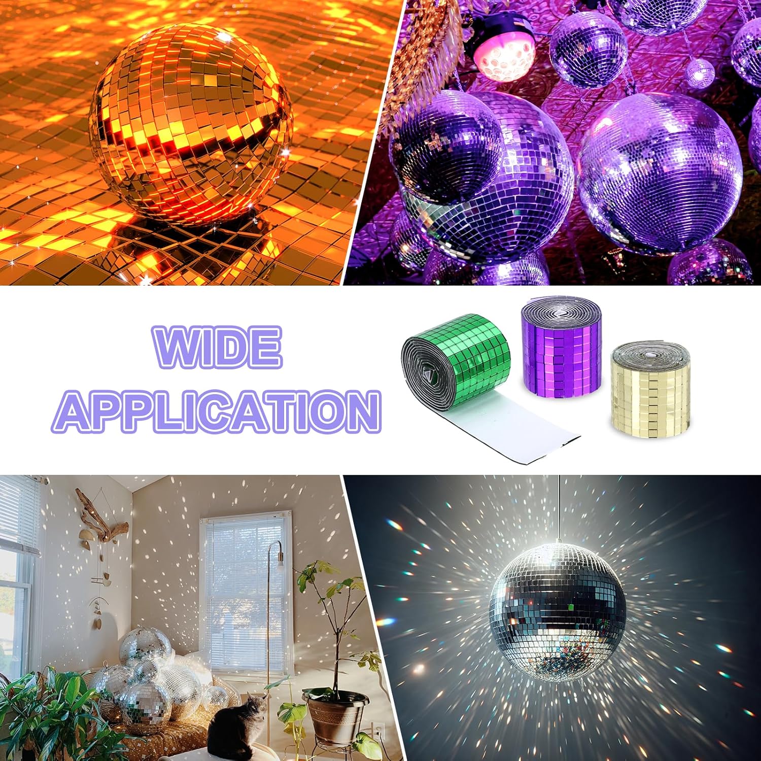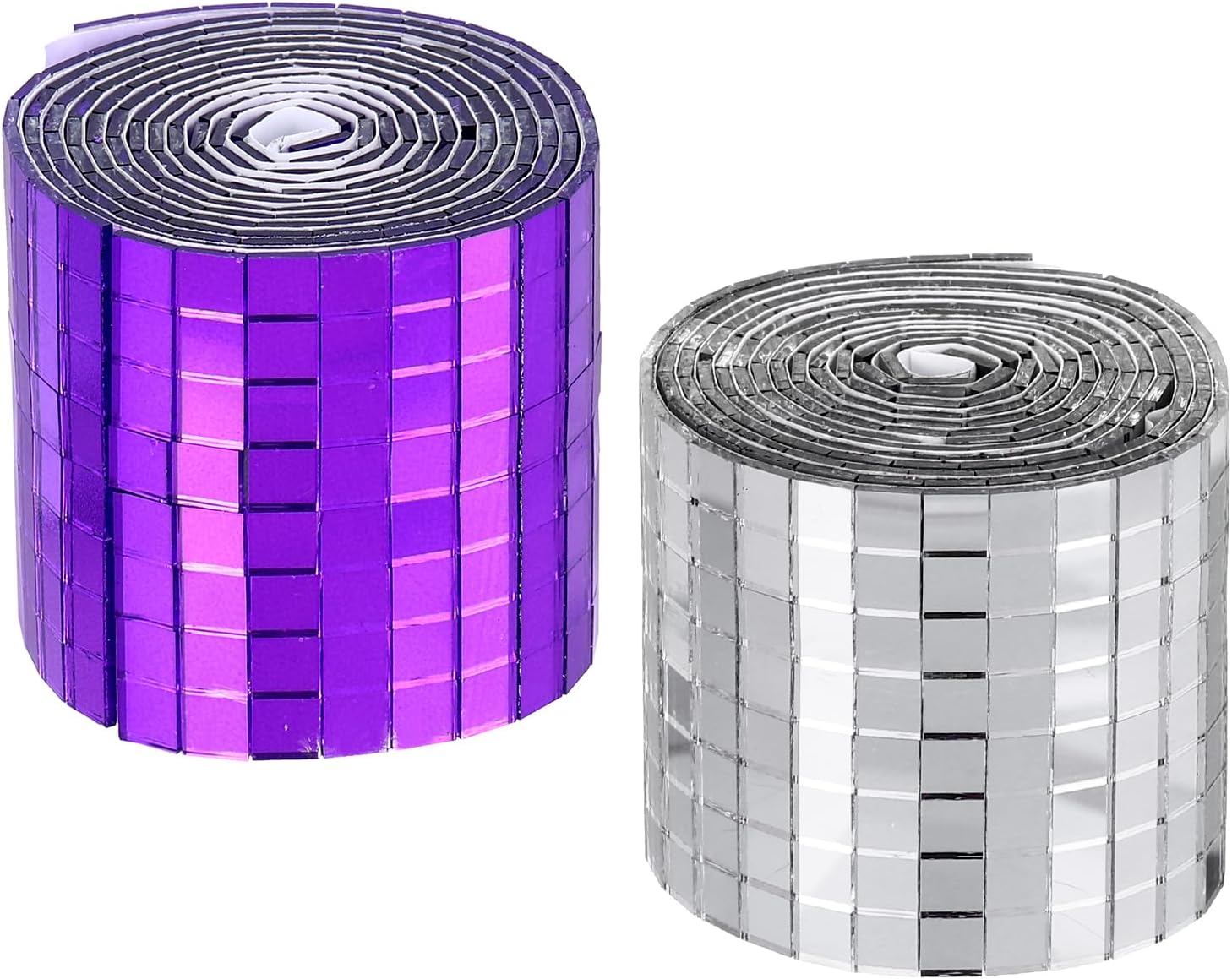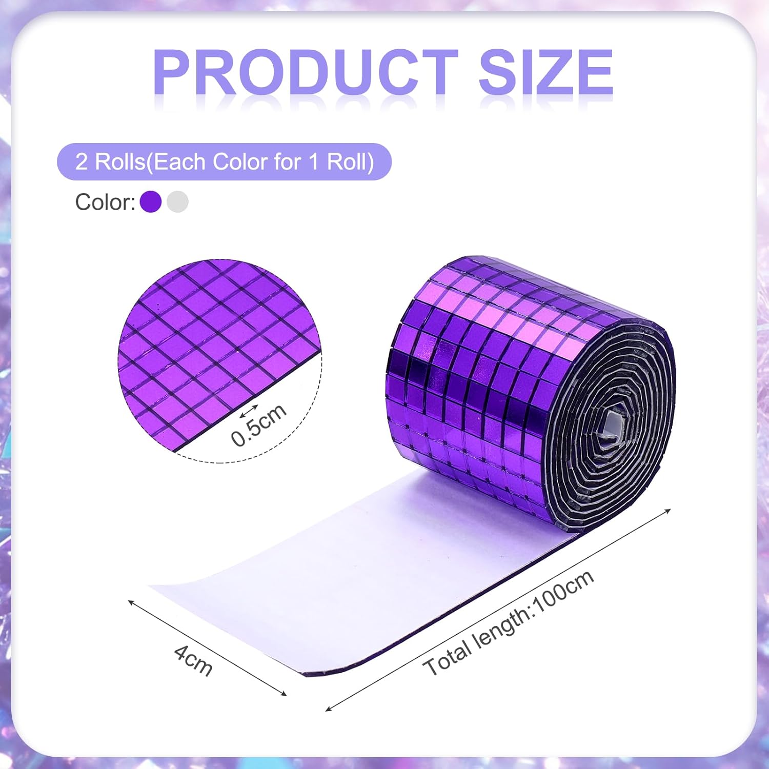 • we provide here, are in the size of: Size: Each roll measures 4 x 100cm (total 2 meters) ; Material: glass with strong adhesive backing ; Color: 1 roll of Purple + 1 roll of Silver (total 2 rolls) ; In the package of: 3200 Pieces Adhesive Mosaic Tiles 5 x 5 mm Disco Tiles 2 Rolls (Purple & Silver)
