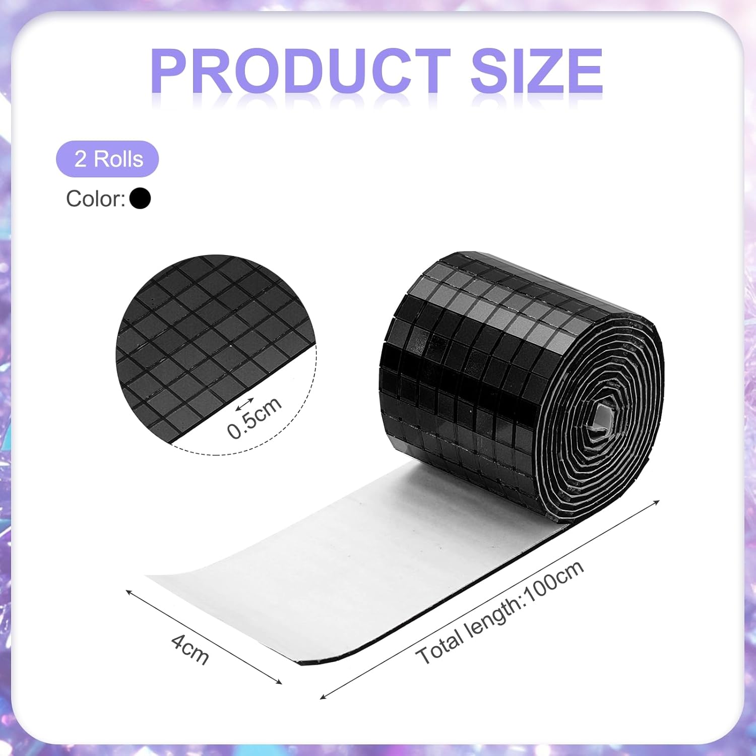 • we provide here, are in the size of: Size: Each roll measures 4 x 100cm (total 2 meters) ; Material: glass with strong adhesive backing ; Color: 2 roll of Black (total 2 rolls) ; In the package of: 3200 Pieces Adhesive Mosaic Tiles 5 x 5 mm Disco Tiles 2 Rolls (Black)