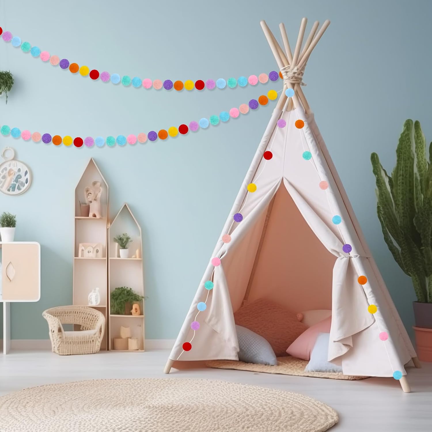 • 4 Sets: You will receive 4 packs of colored felt ball strings, each with a size of 1 inch and 30 balls/6.5 feet per string, totaling 26.5 feet. The quantity is enough for you to decorate your home as you please
